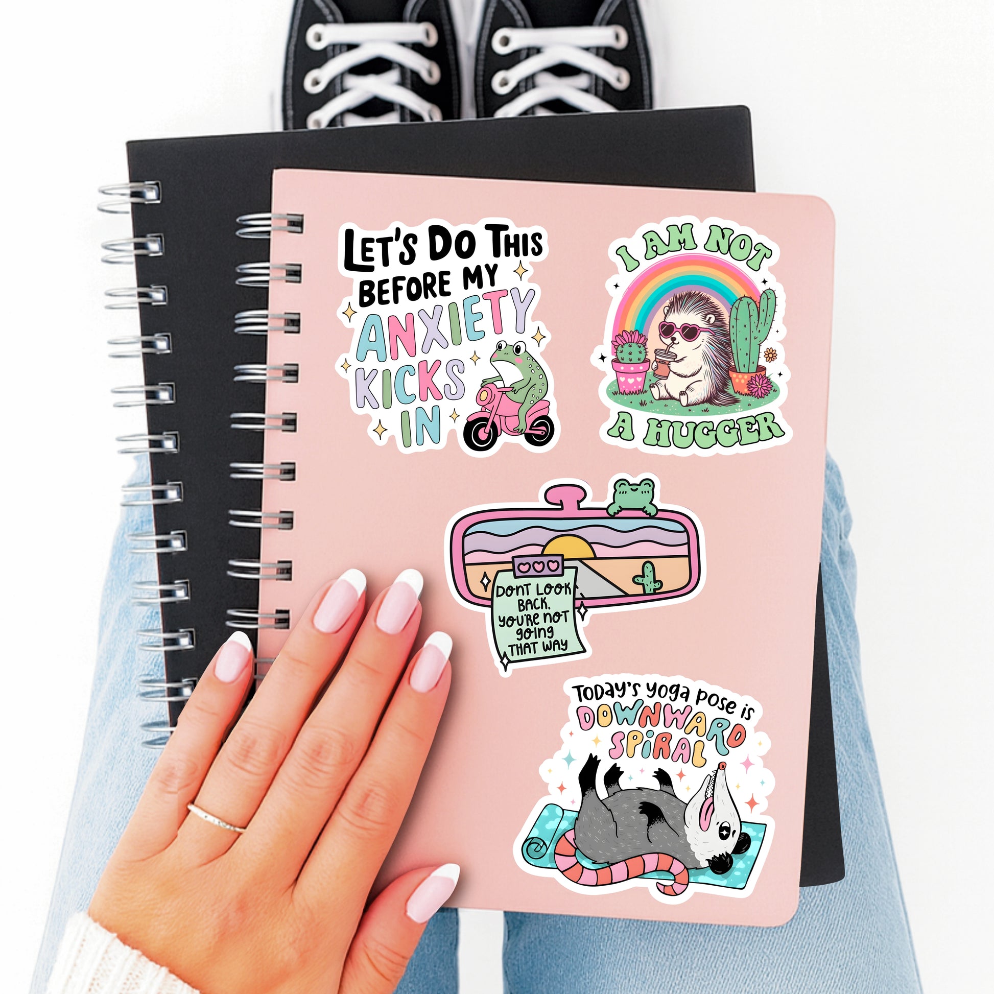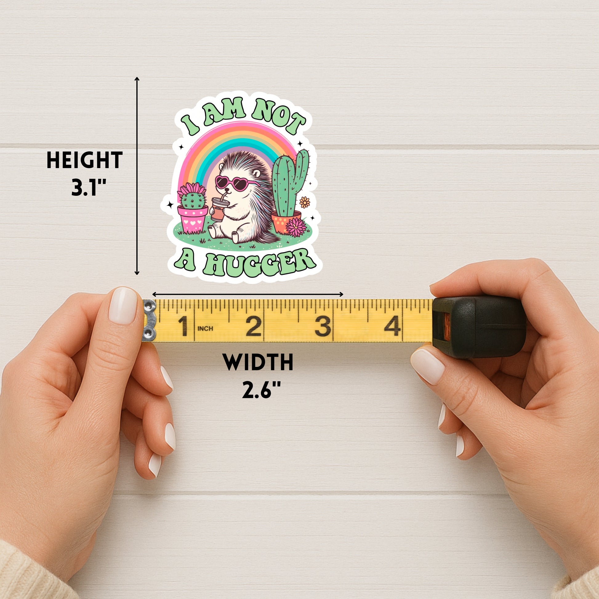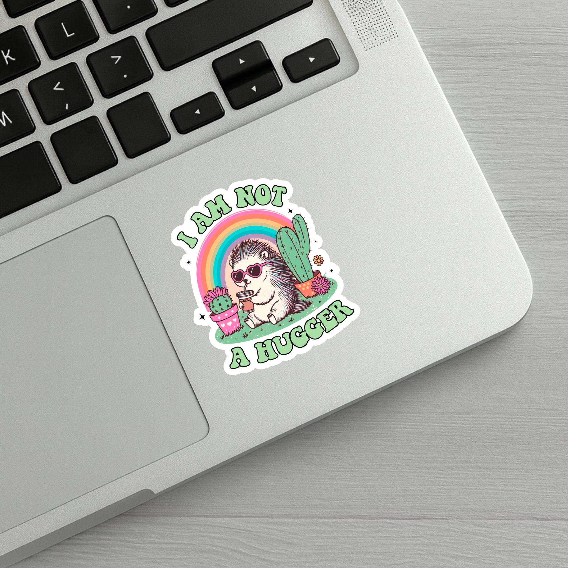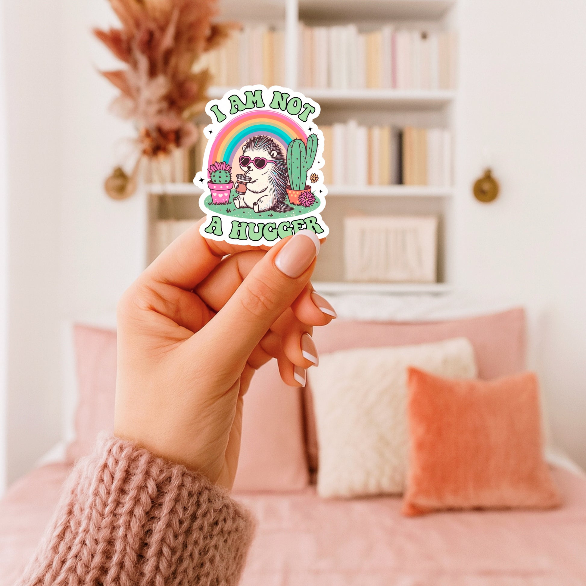 A handmade, funny sticker featuring a chill porcupine sipping a drink and rocking sunglasses while surrounded by cactuses. With the phrase “I’m not a hugger,” this sticker perfectly captures the mood for anyone who loves personal space and a touch of humor.