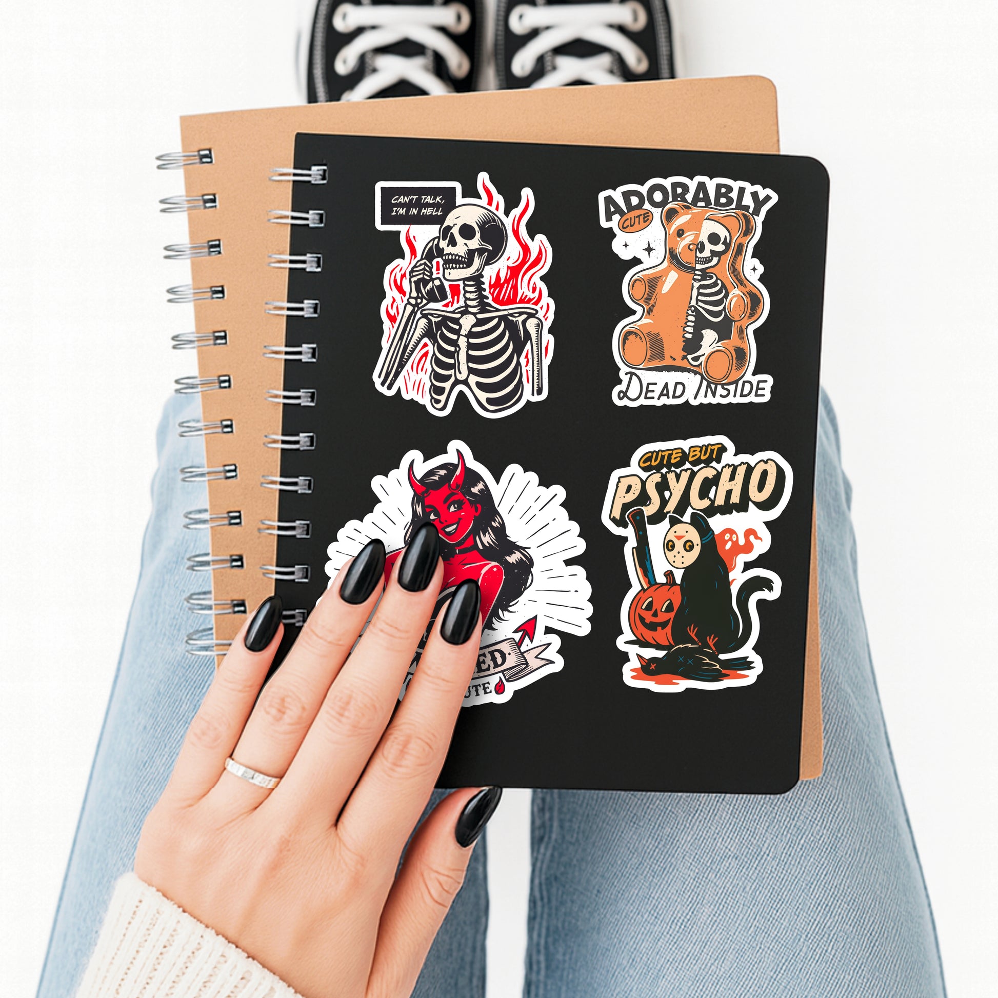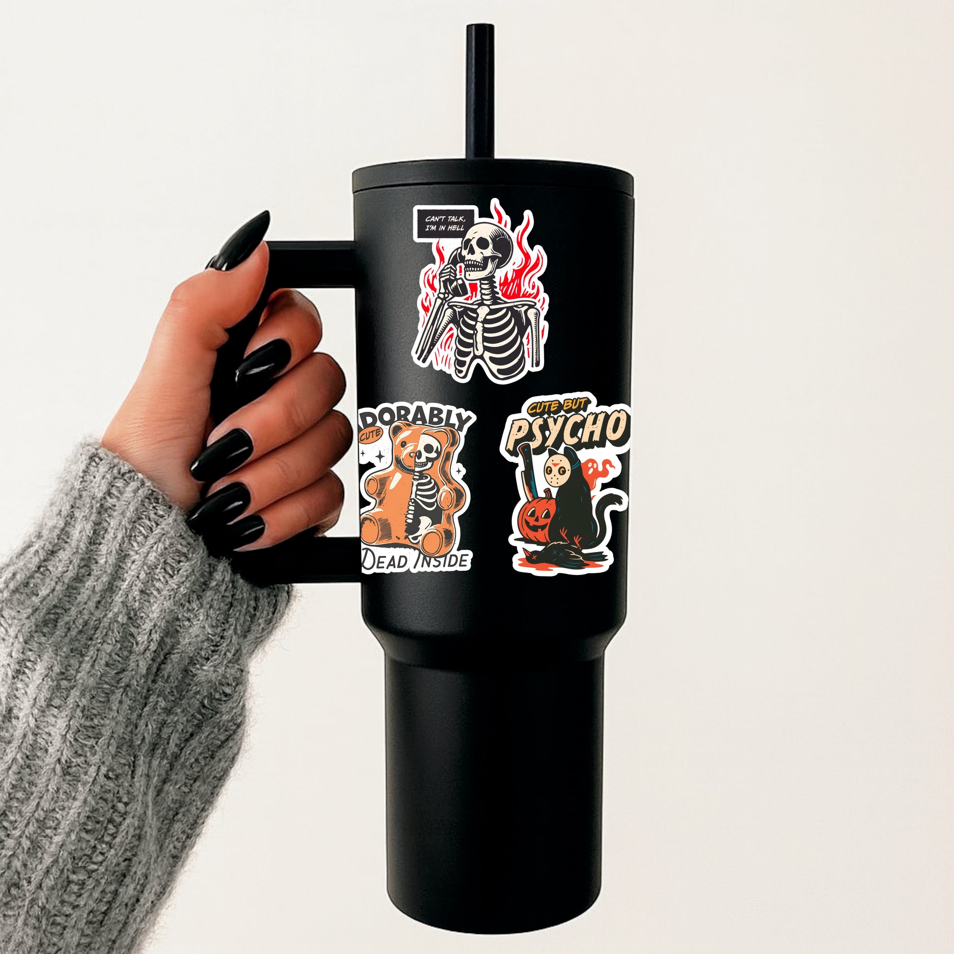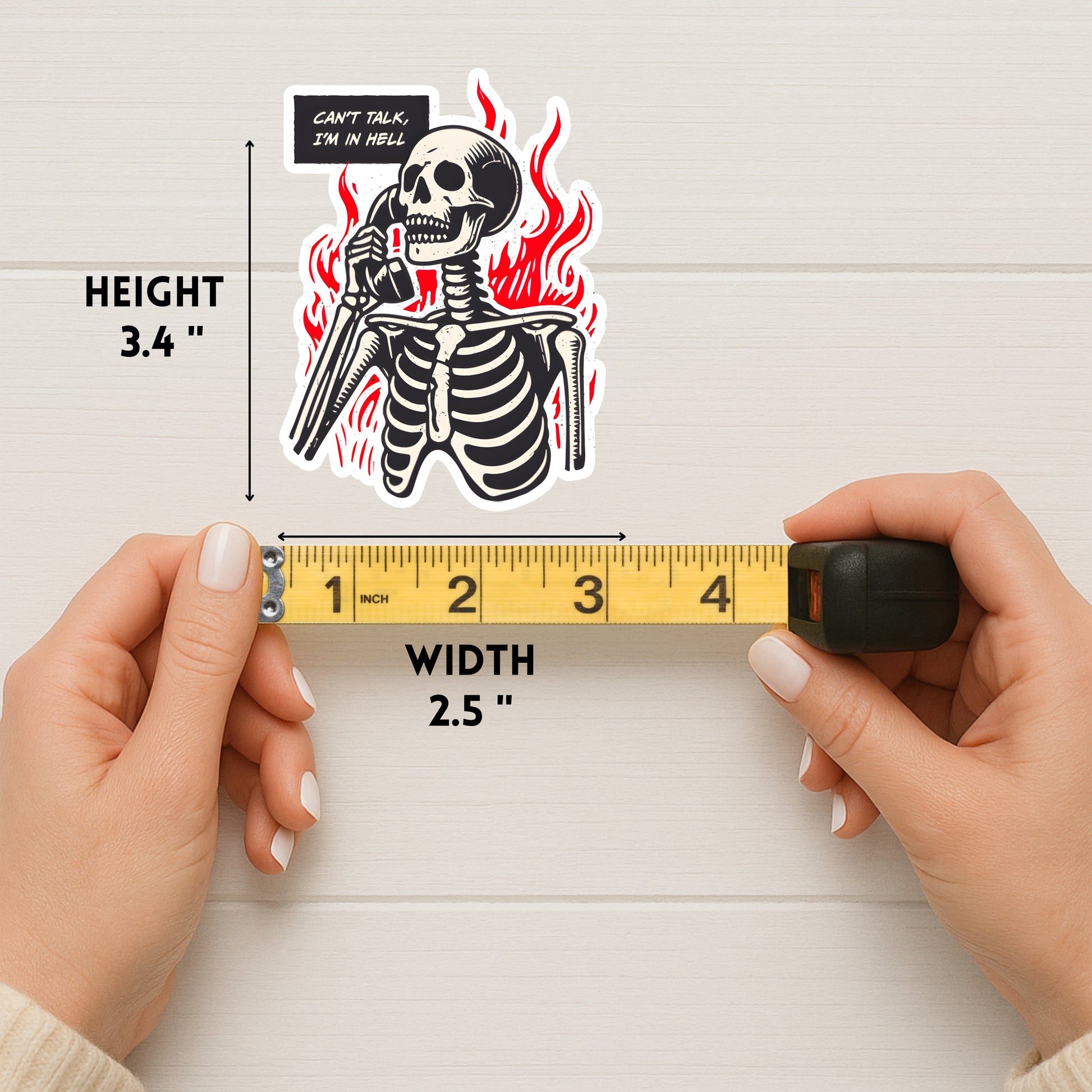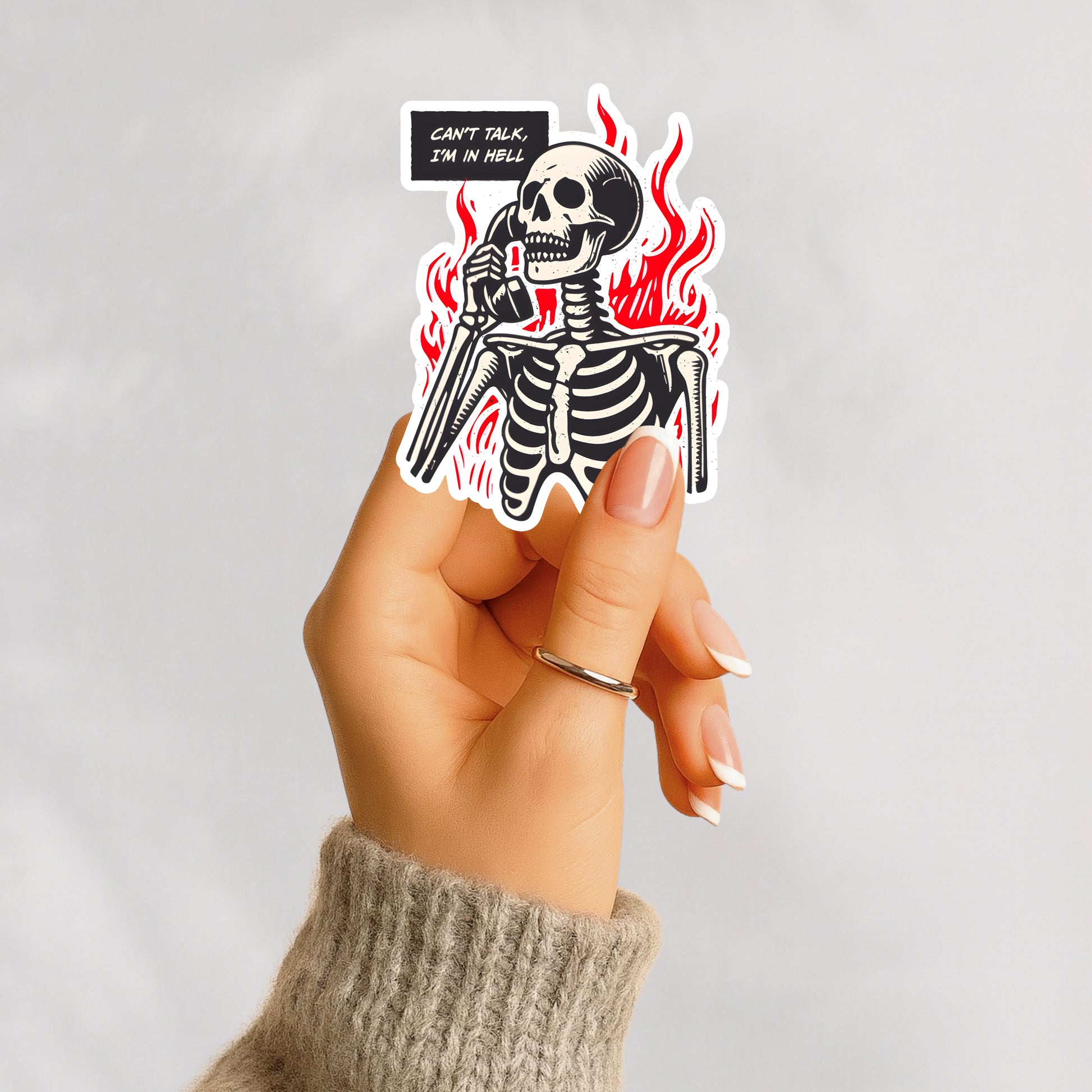 This handmade sticker features a skeleton chatting on the phone with red flames in the background and the phrase “Can’t Talk, I’m in Hell.” Equal parts spooky and hilarious, it’s a great choice for Halloween lovers, dark humor fans, or anyone who enjoys a touch of sarcasm.