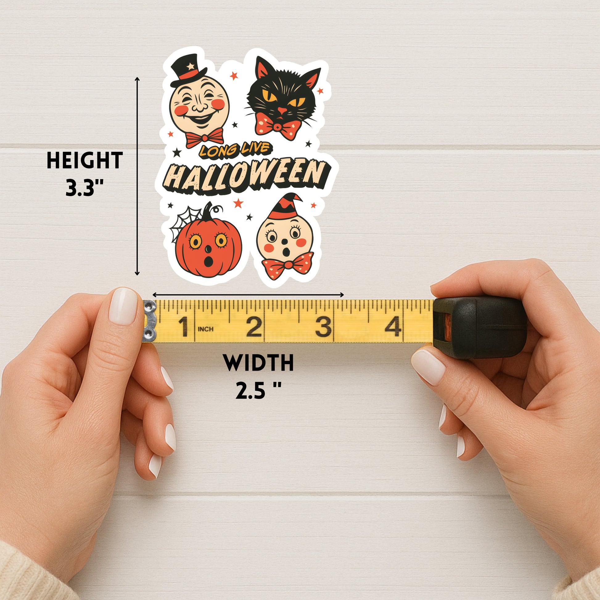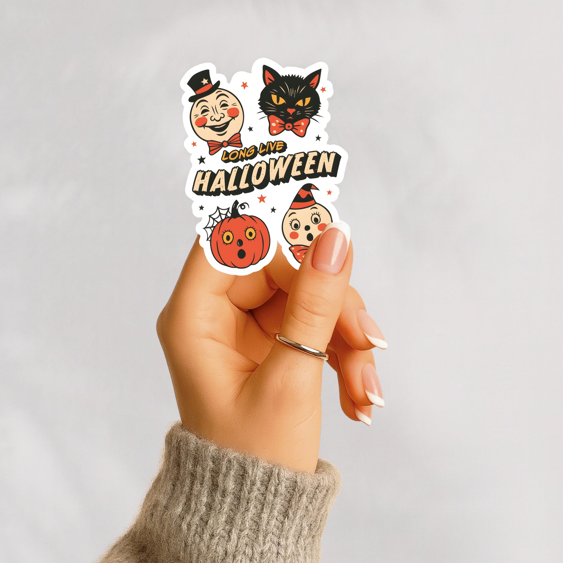 This handmade sticker features a retro-style design with three classic Halloween characters — including a cat and a pumpkin — and the phrase “Long Live Halloween.” Perfect for spooky season lovers who adore old-school Halloween aesthetics.