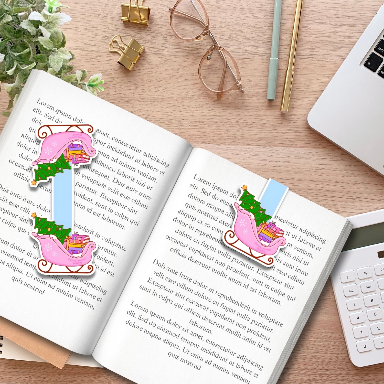 This handmade magnetic bookmark features a festive pink sleigh filled with a Christmas tree and gifts, capturing cozy holiday and bookish vibes. Printed on high-quality magnetic paper and sealed with an Avery clear laminating sheet, it is slim, lightweight, and perfect for seasonal reading or gifting.