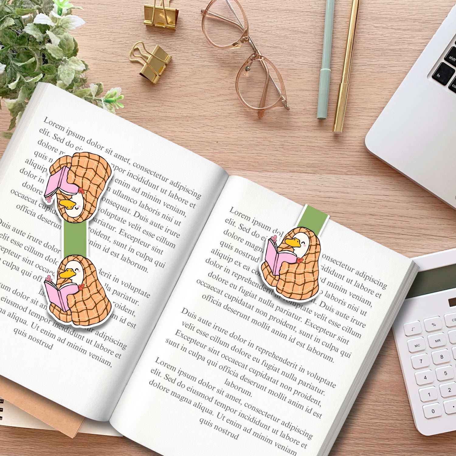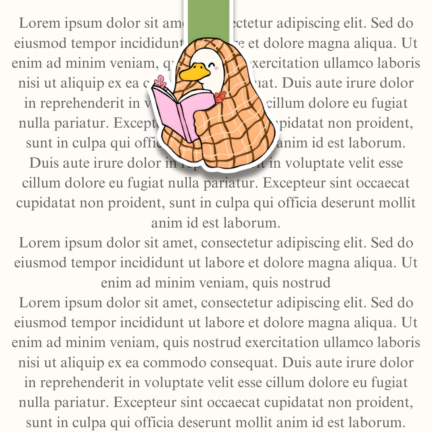 This completely handmade magnetic bookmark features an adorable duck completely draped in a cozy blanket, with its head peeking out as it reads a book. Perfect for chilly days, fall, or winter reading, this whimsical design adds warmth and charm to any book. Printed on high-quality magnetic paper and sealed with an Avery clear laminating sheet, it is slim, lightweight, and delightfully cozy.