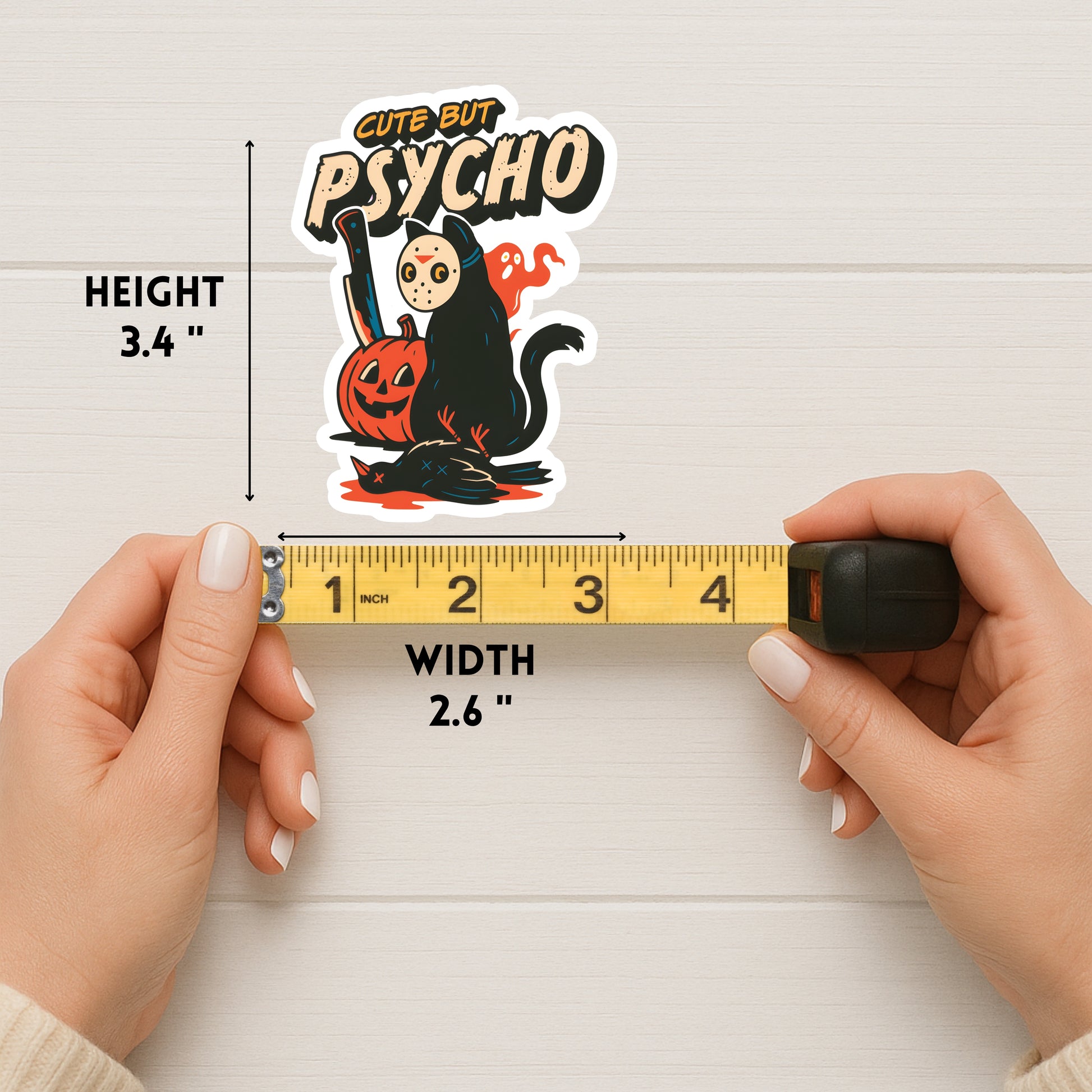 This handmade sticker features a cat in a mask with a spooky horror-inspired scene — the perfect mix of cute and psycho. Great for cat lovers, horror fans, and anyone with a sense of dark humor.