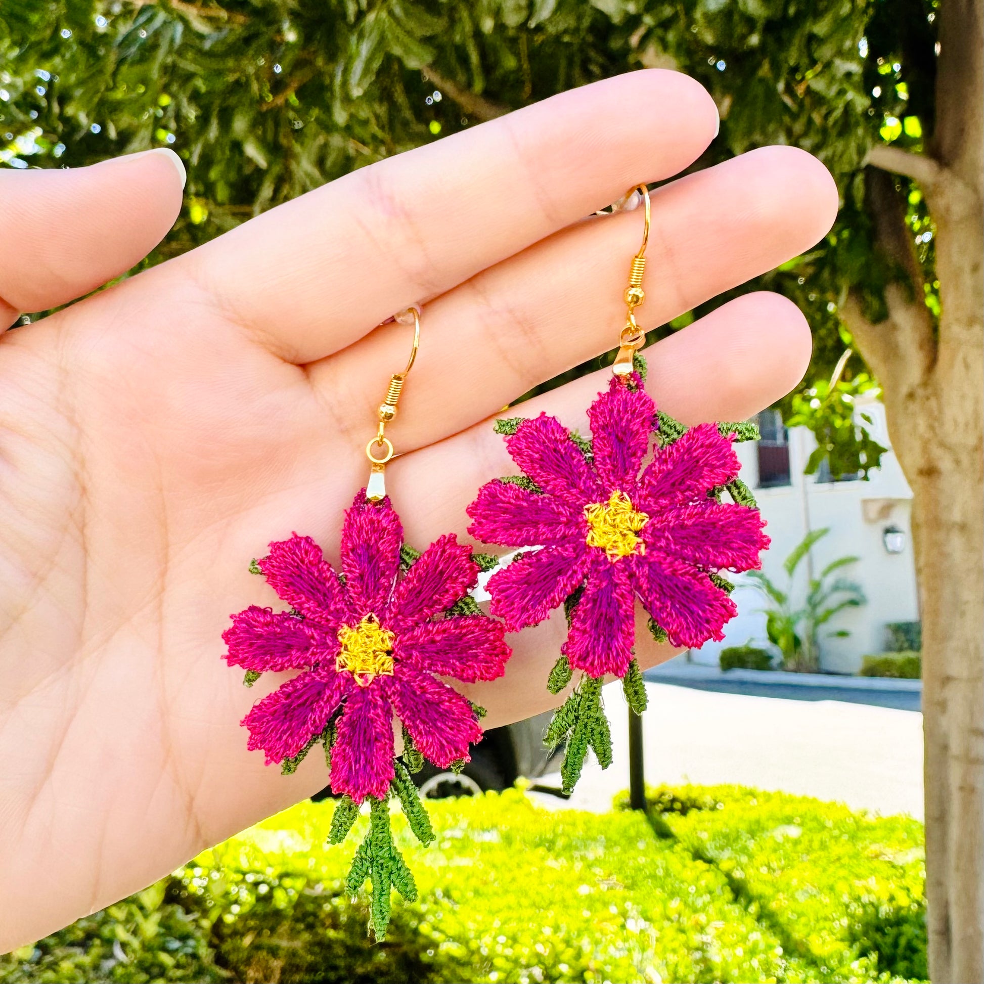 Handmade, delicate earrings featuring a beautifully embroidered Cosmos flower design. Each pair is carefully crafted with vibrant thread on aqua mesh fabric, creating a lightweight and detailed floral statement. Perfect for floral lovers, nature enthusiasts, or anyone who wants a unique handmade accessory.
