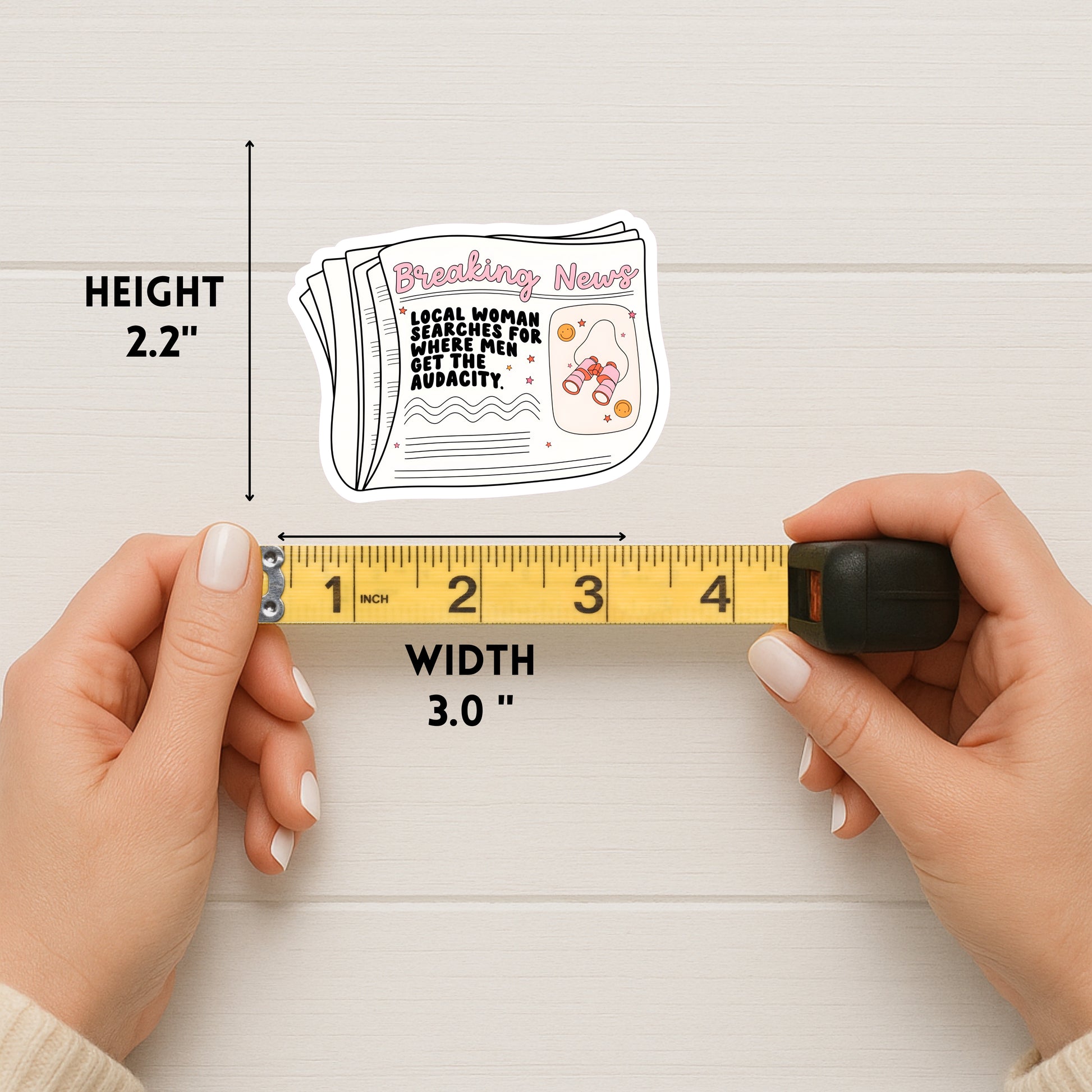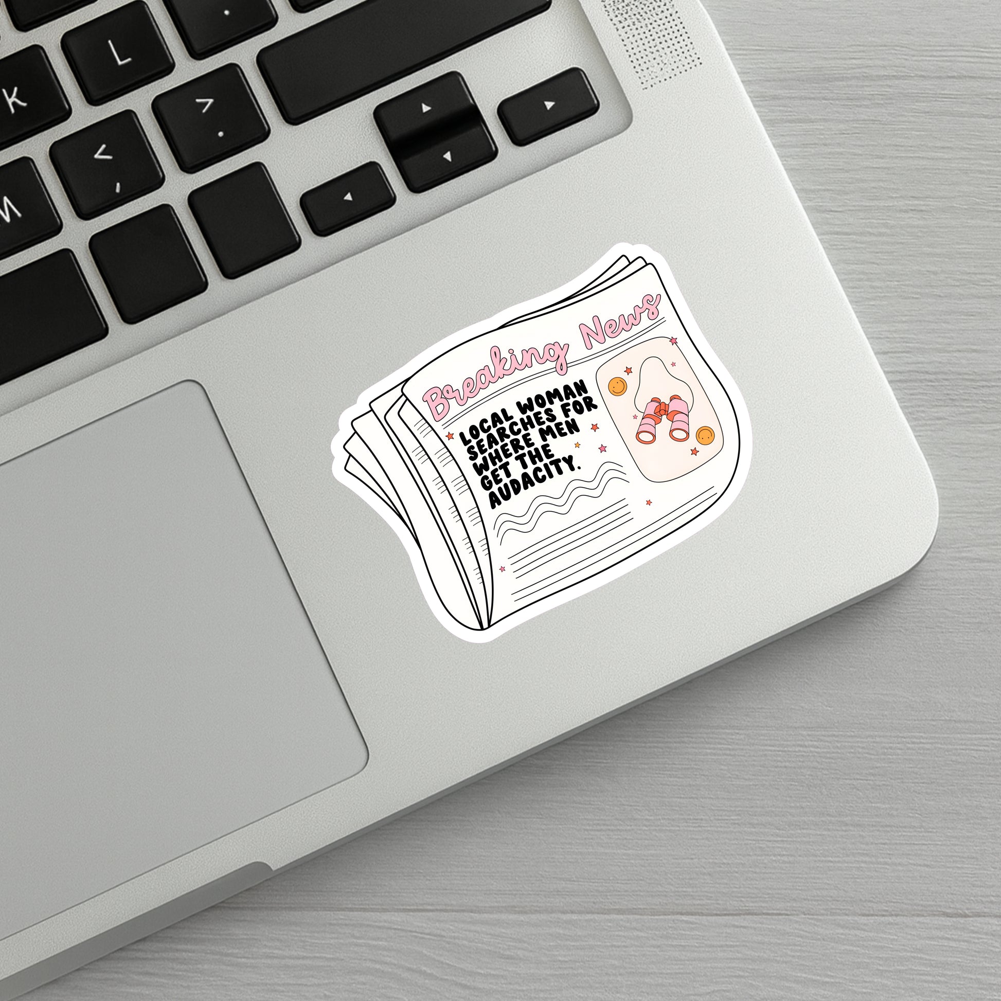 A handmade, witty sticker designed like a newspaper with the headline “Breaking News: Local Woman Searches for Where Men Get the Audacity.” Perfect for anyone who loves bold humor, feminist energy, and a touch of sarcasm. Add it to your laptop, water bottle, or notebook for a daily dose of attitude.