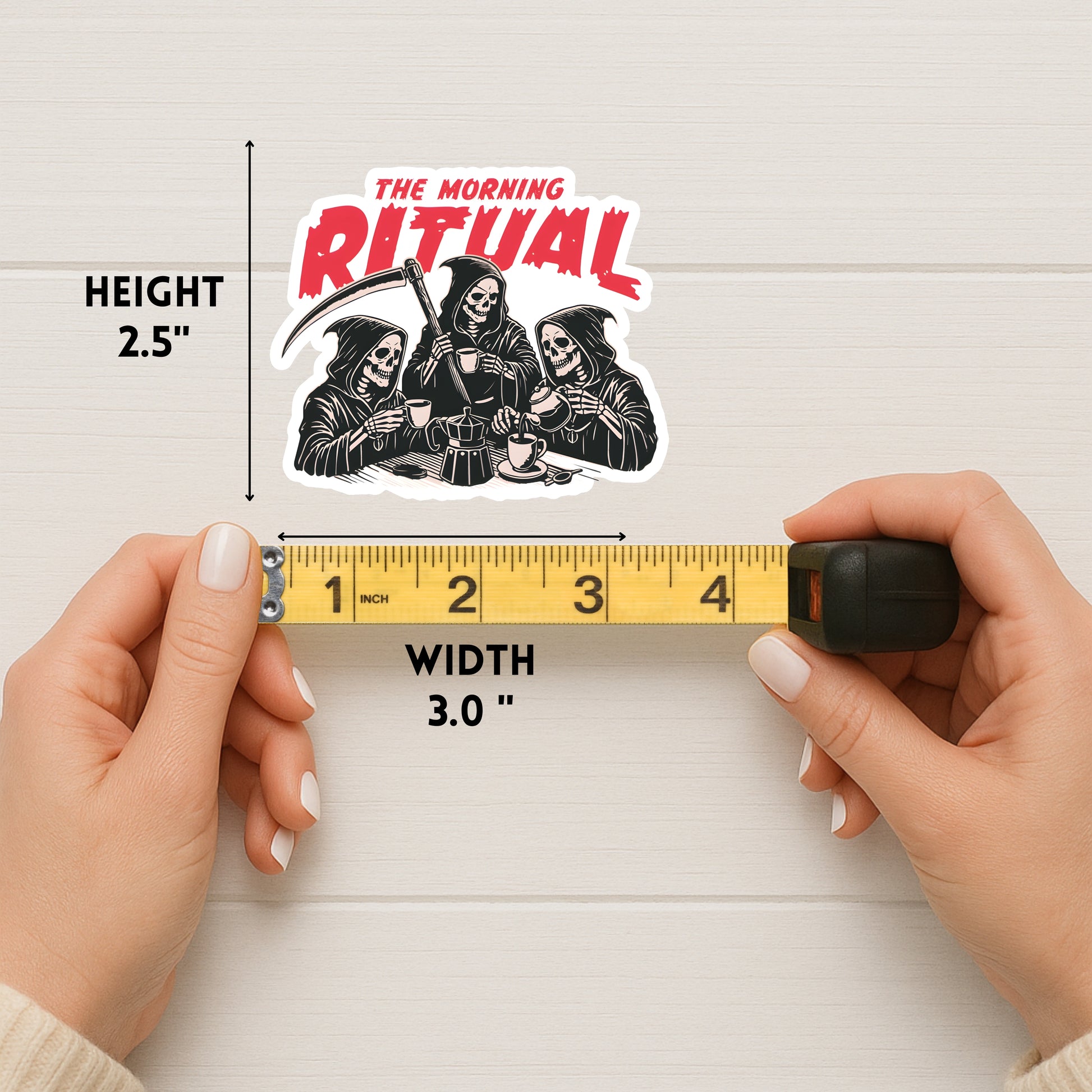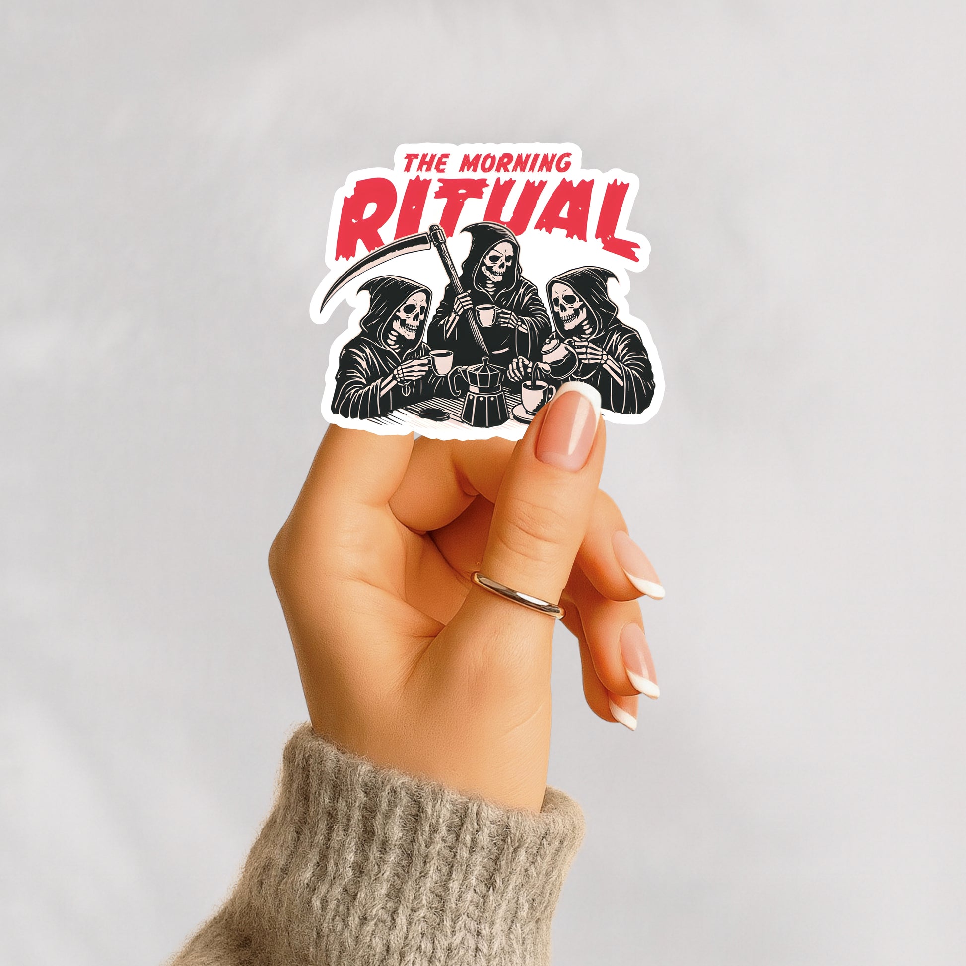 The Morning Ritual Sticker | Funny Horror Sticker | Grim Reaper Coffee | Halloween Gift