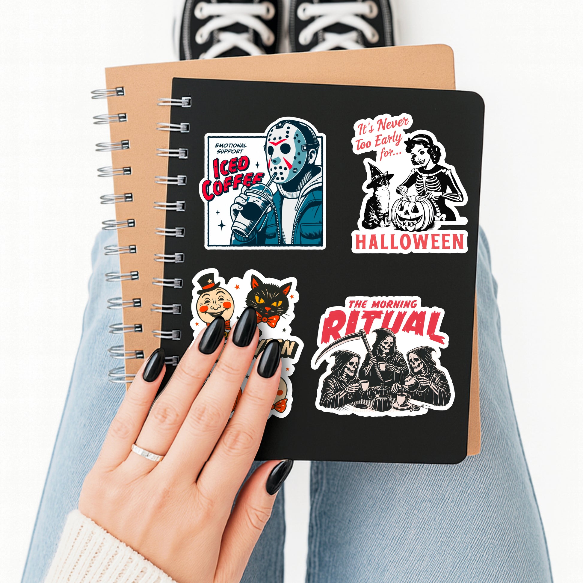 A handmade, spooky sticker perfect for horror fans who appreciate dark humor and their morning coffee ritual. This sticker features three grim reapers sitting together enjoying coffee — a hilarious twist on your daily routine.