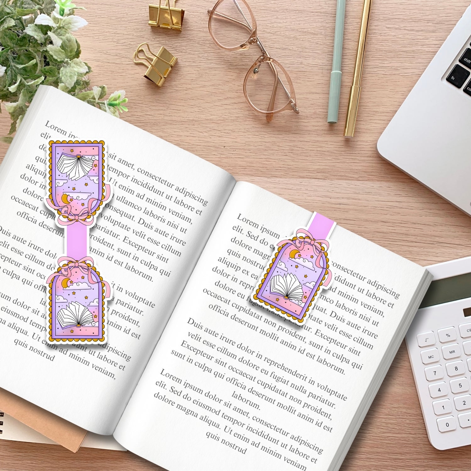 This completely handmade magnetic bookmark features a whimsical design of an open book set against a background of clouds and stars, all surrounded by a cute decorative frame. Perfect for dreamers, stargazers, and book lovers, this bookmark adds a magical touch to any reading session. Printed on high-quality magnetic paper and sealed with an Avery clear laminating sheet, it is slim, lightweight, and delightfully charming.