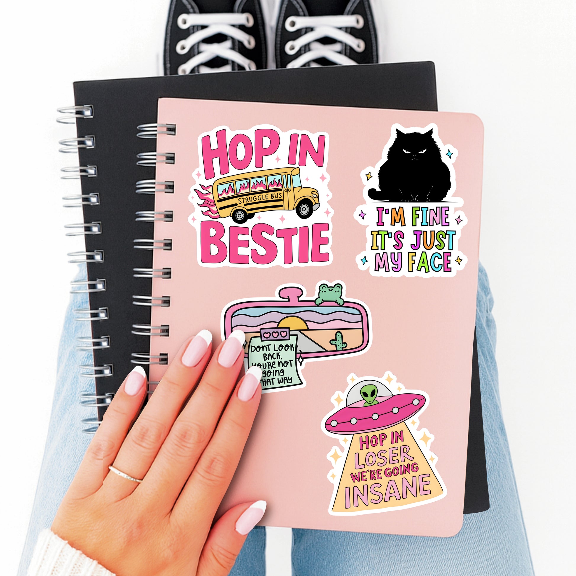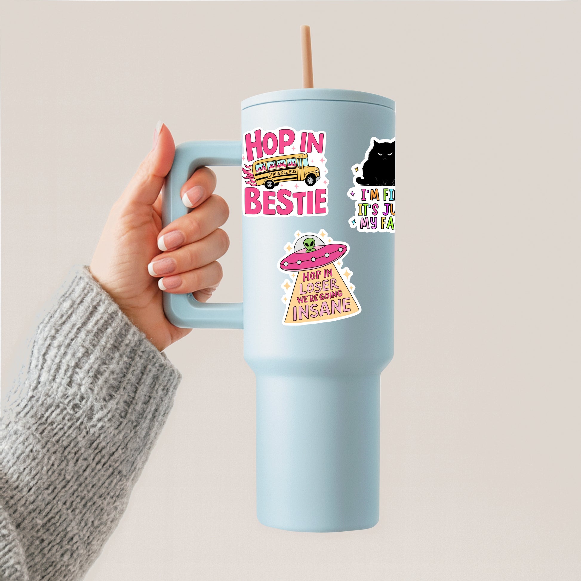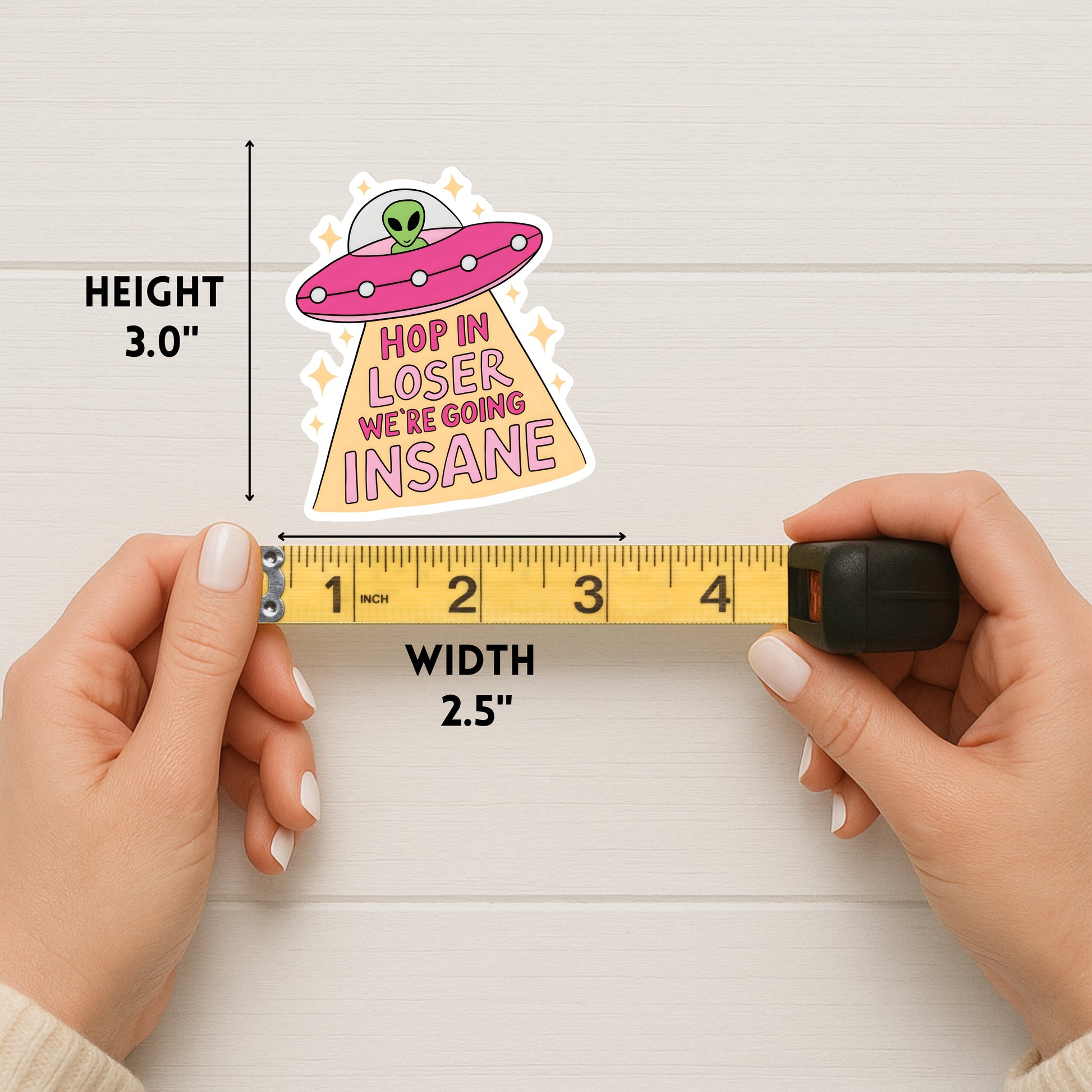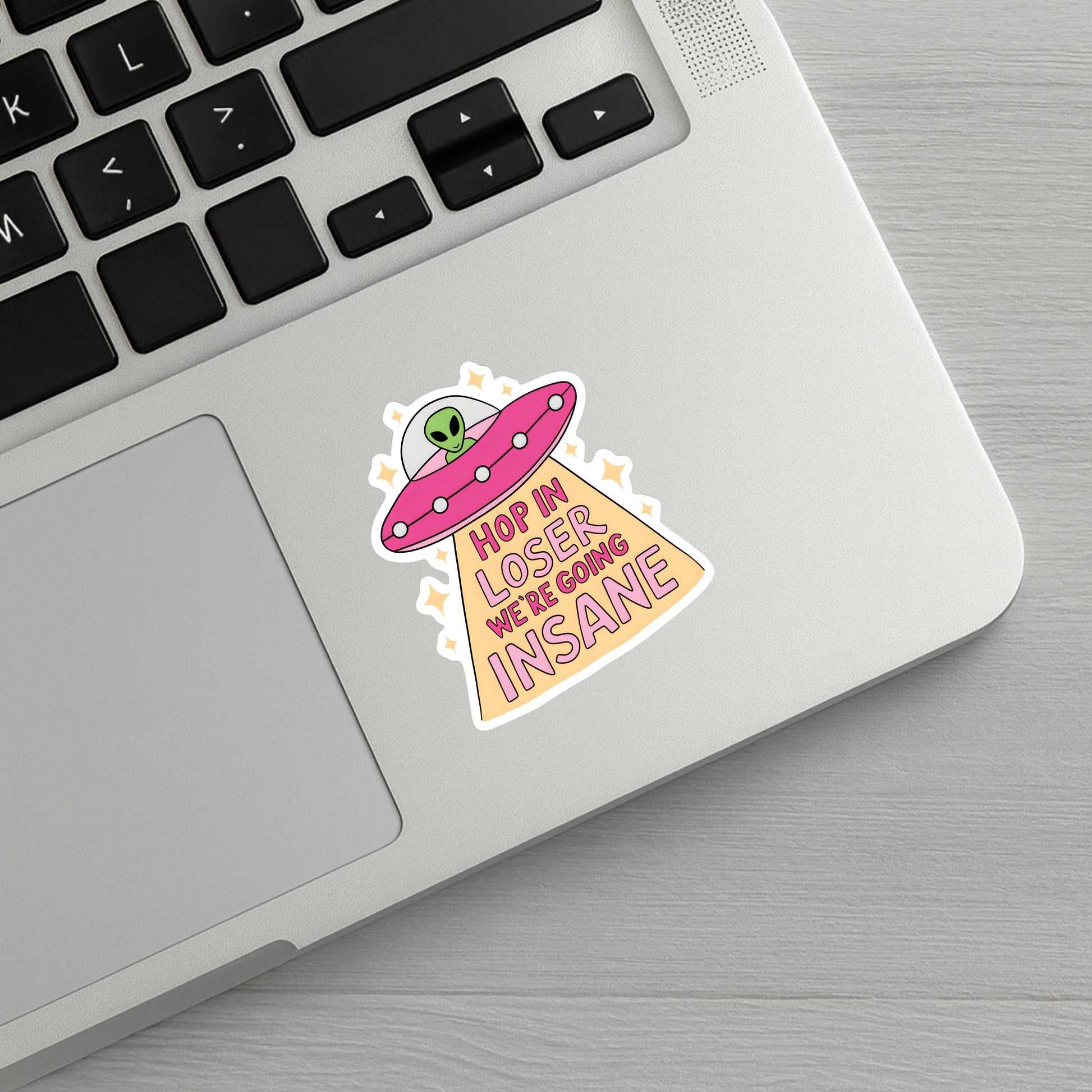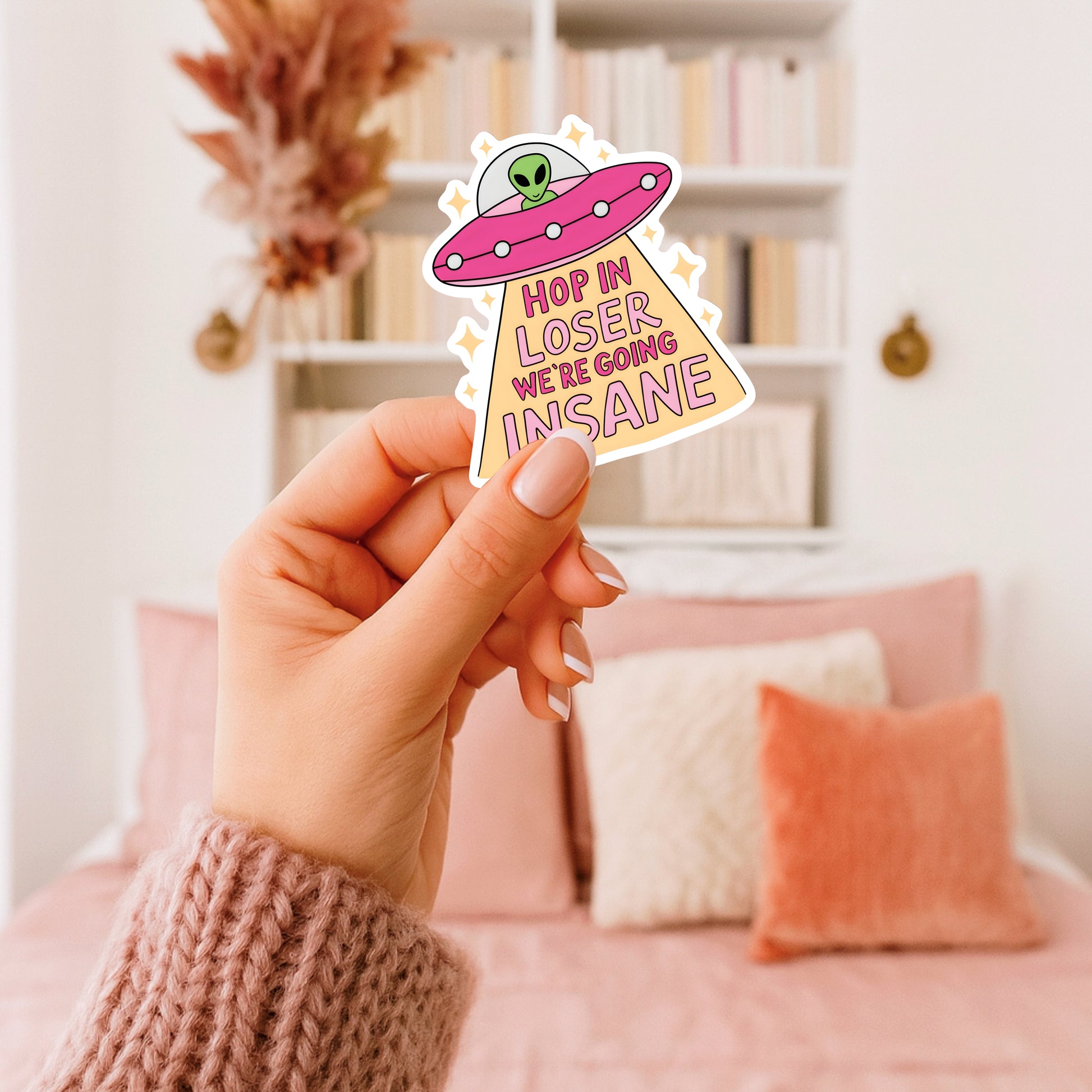 A handmade, hilarious sticker featuring a spaceship beaming down light that spells out “Hop in loser, we’re going insane.” Complete with a little alien at the controls, this design perfectly captures that out-of-this-world kind of chaos we can all relate to.