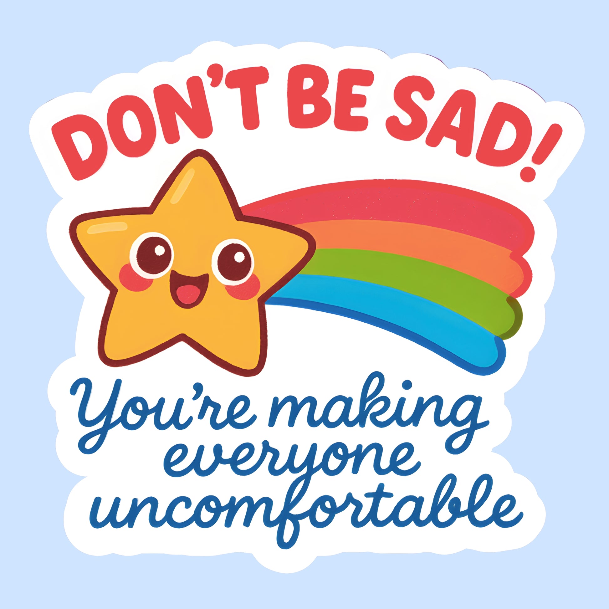 A handmade, funny sticker featuring a cheerful star with a rainbow trail and the phrase, “Don’t be sad, you’re making everyone uncomfortable.” This snarky yet colorful design is perfect for anyone who uses humor to cope or loves a dose of ironic positivity.
