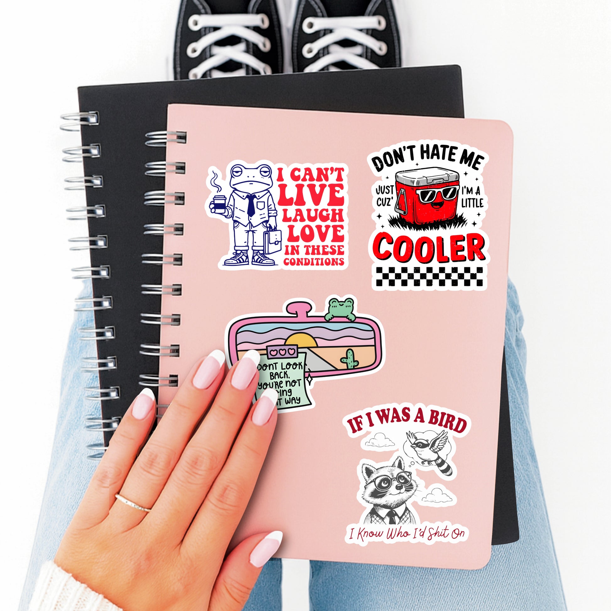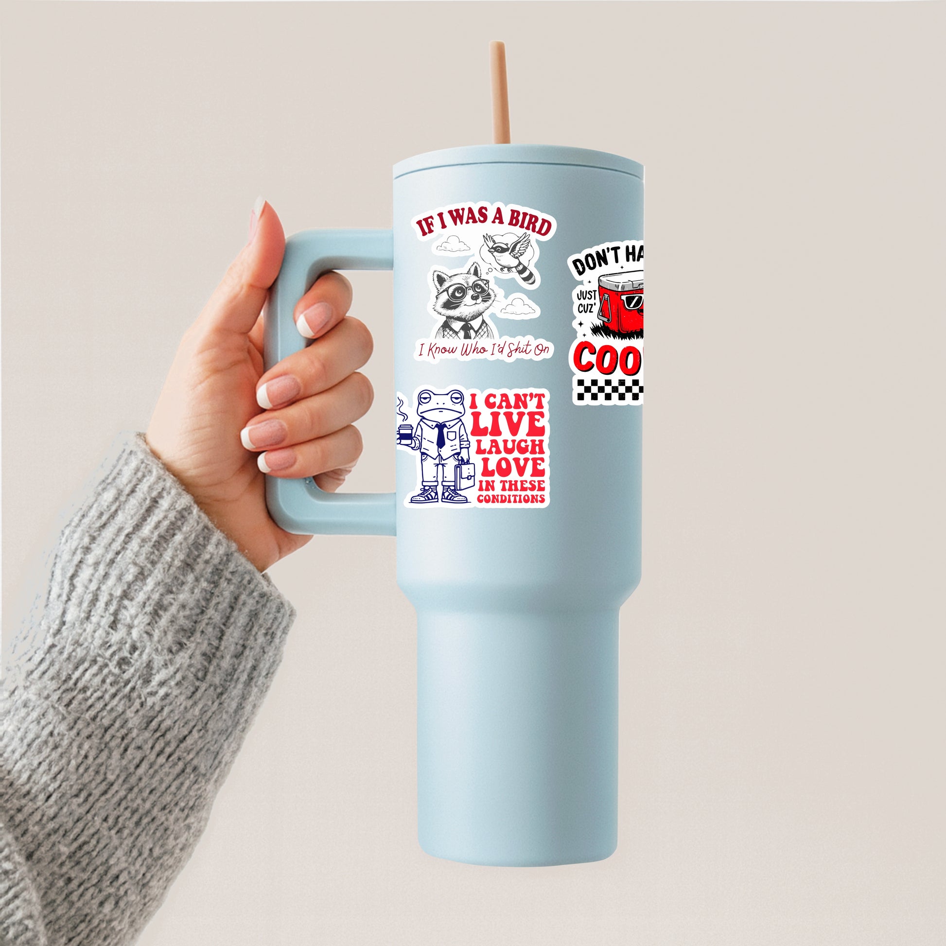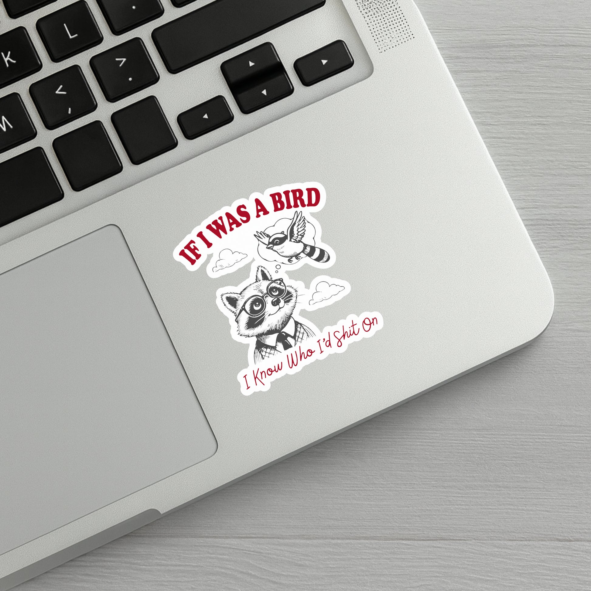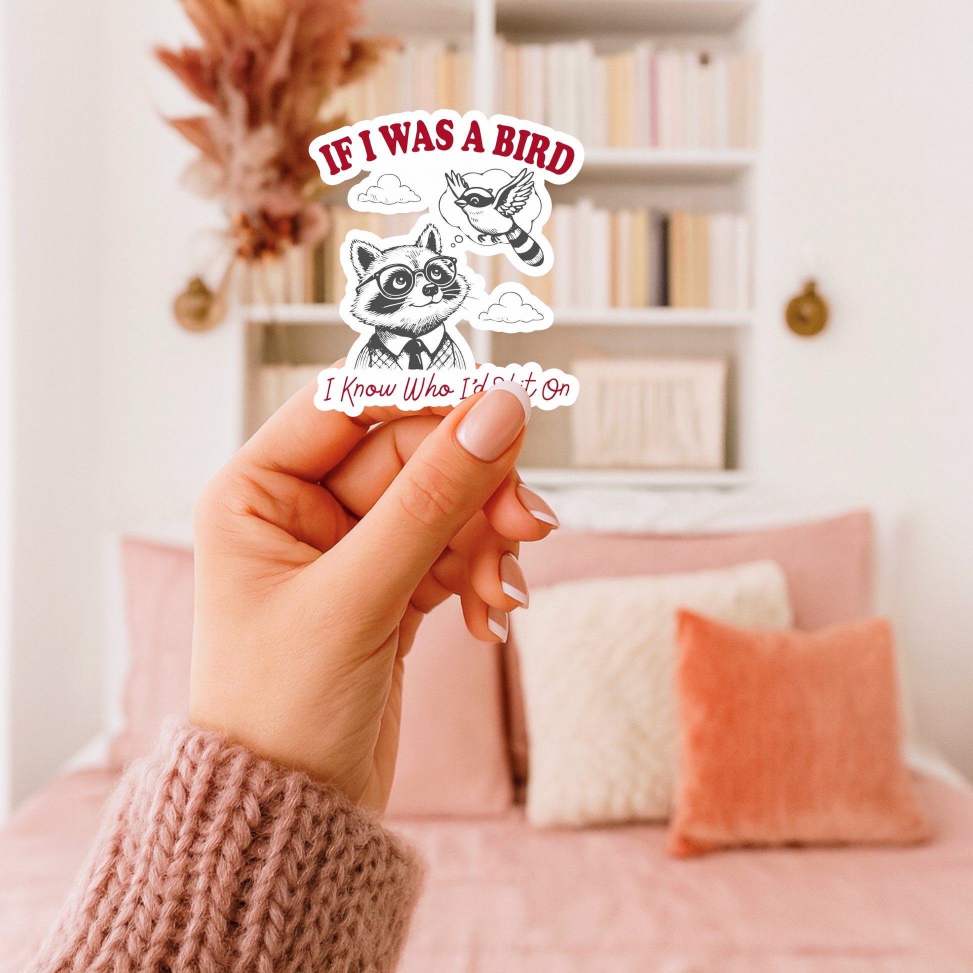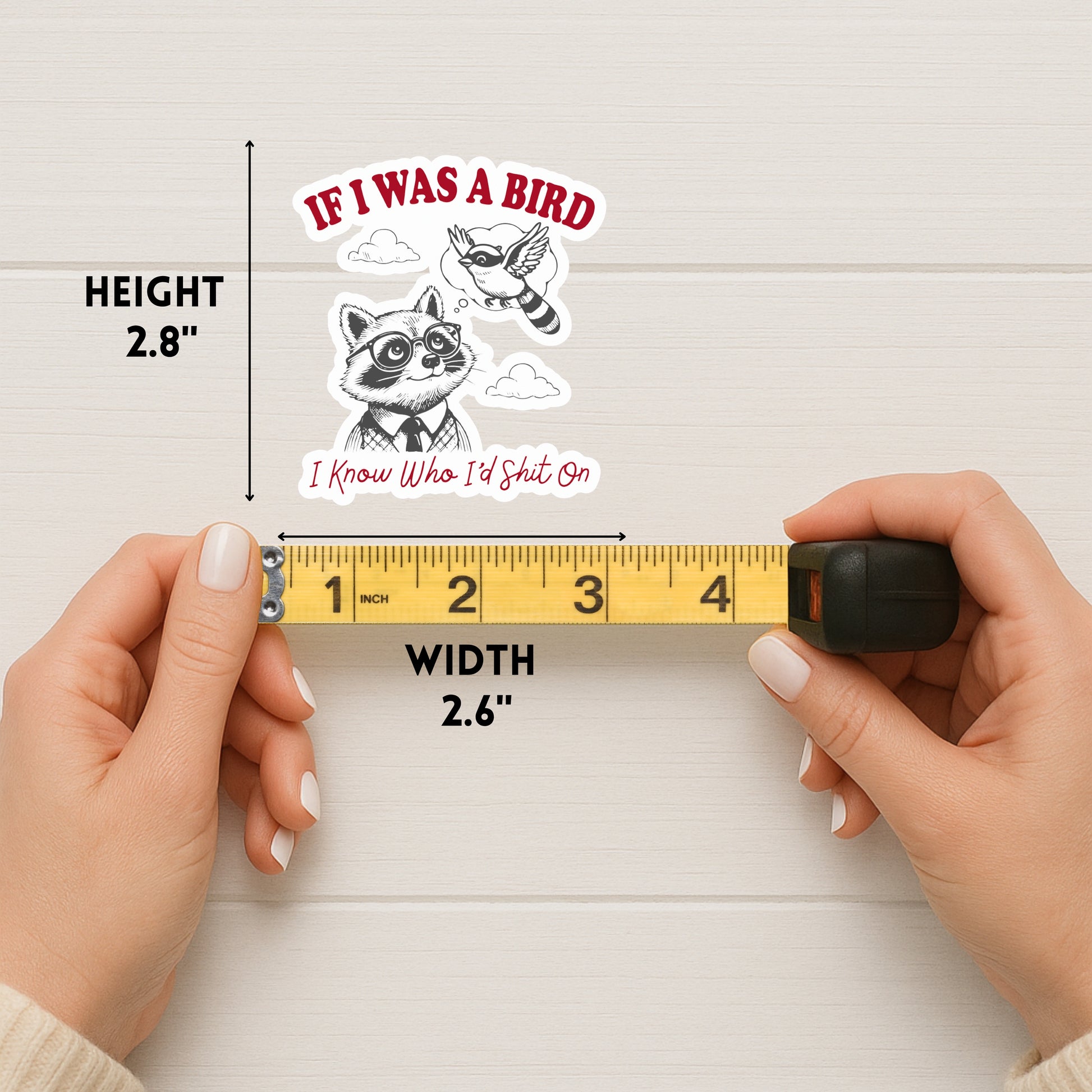A handmade, funny sticker featuring a raccoon glaring up at a bird with the quote, “If I was a bird, I know who I’d shit on.” Perfect for those days when you’re keeping it real — and a little petty.