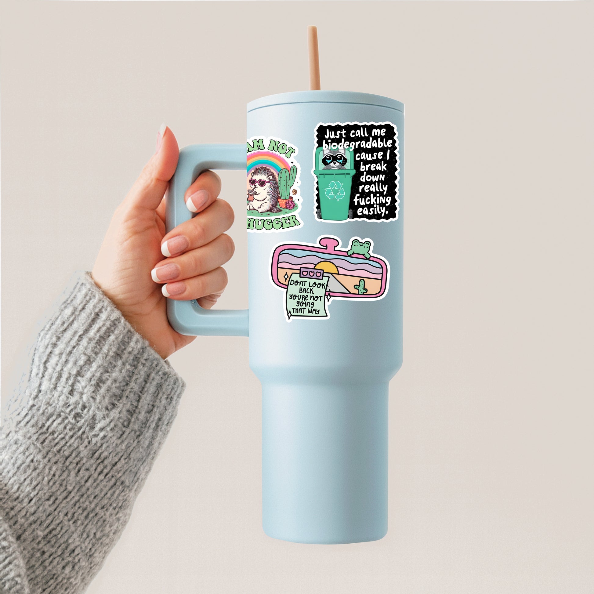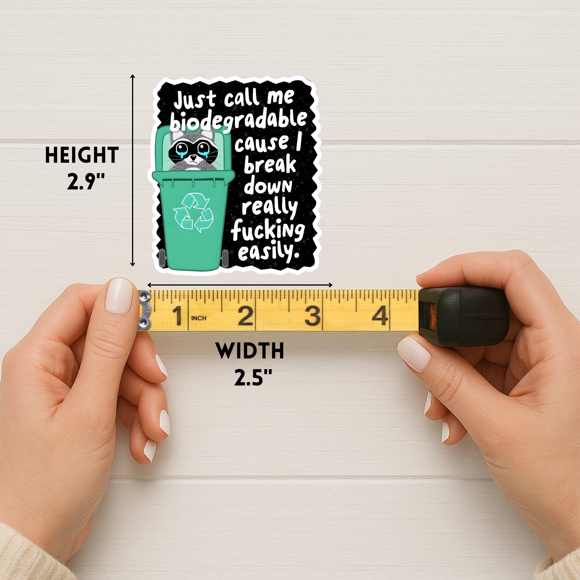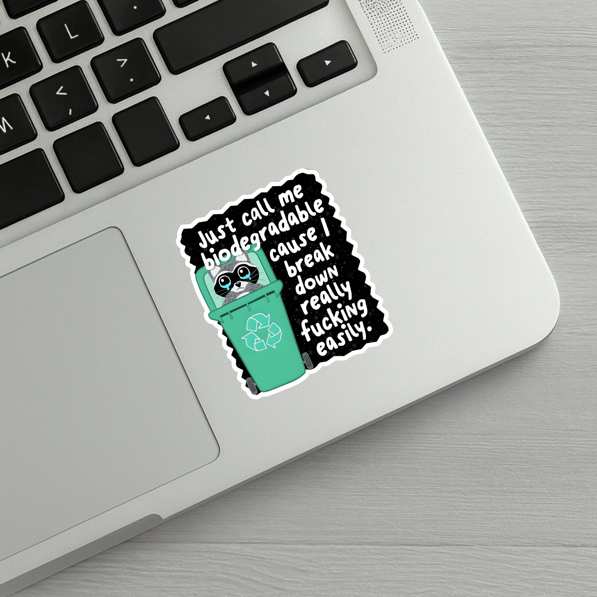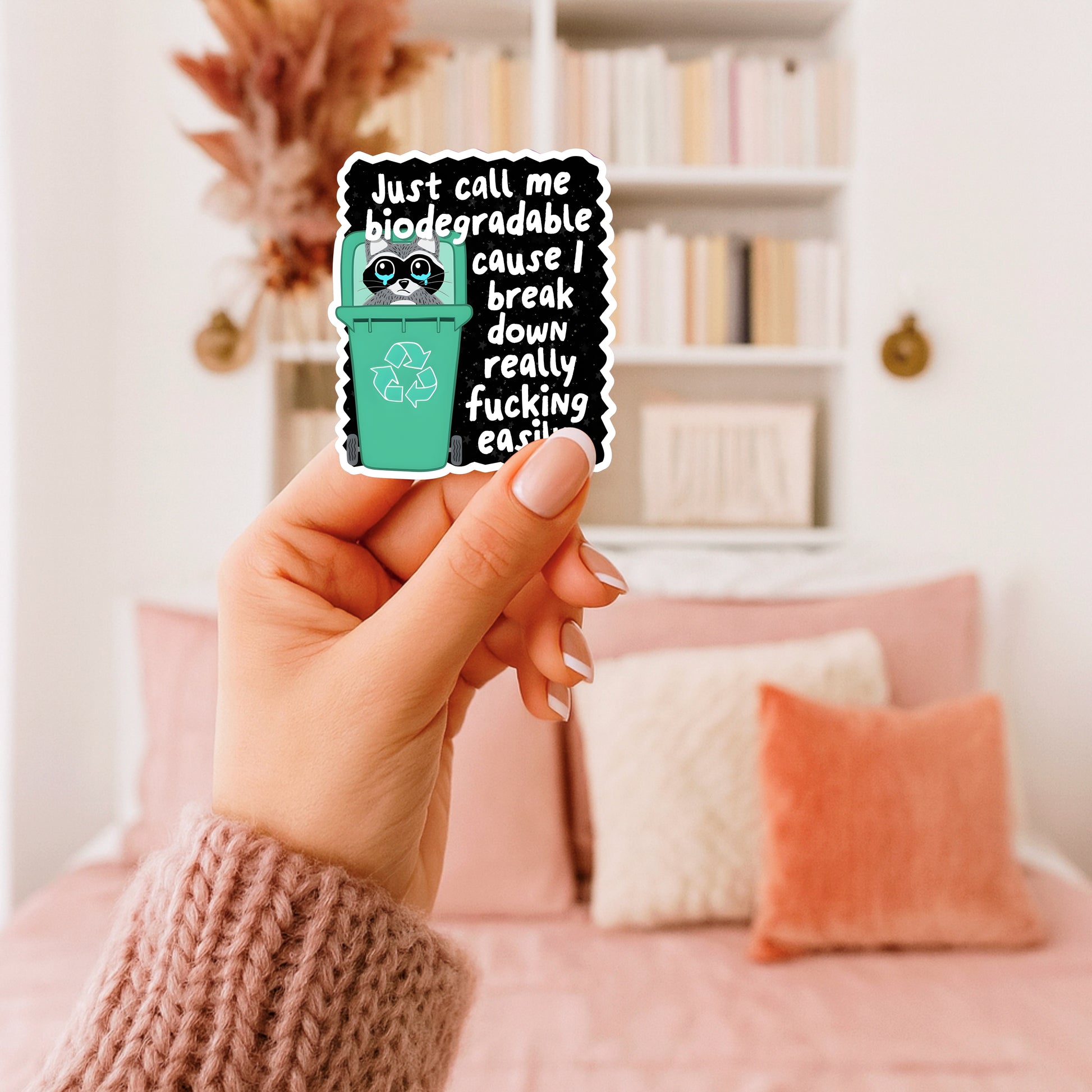 A handmade, relatable sticker featuring a raccoon sitting in a biodegradable bin with the phrase, “Just call me biodegradable ‘cause I break down really f***ing easily.” Perfect for anyone who appreciates dark humor, mental health jokes, or just loves raccoons and chaos.