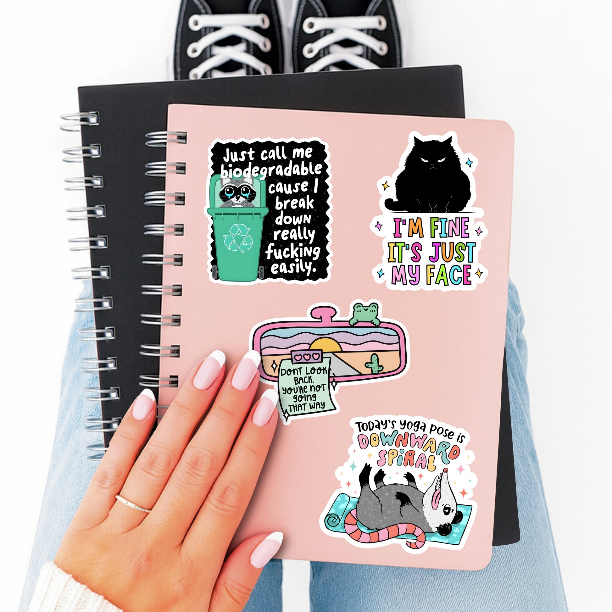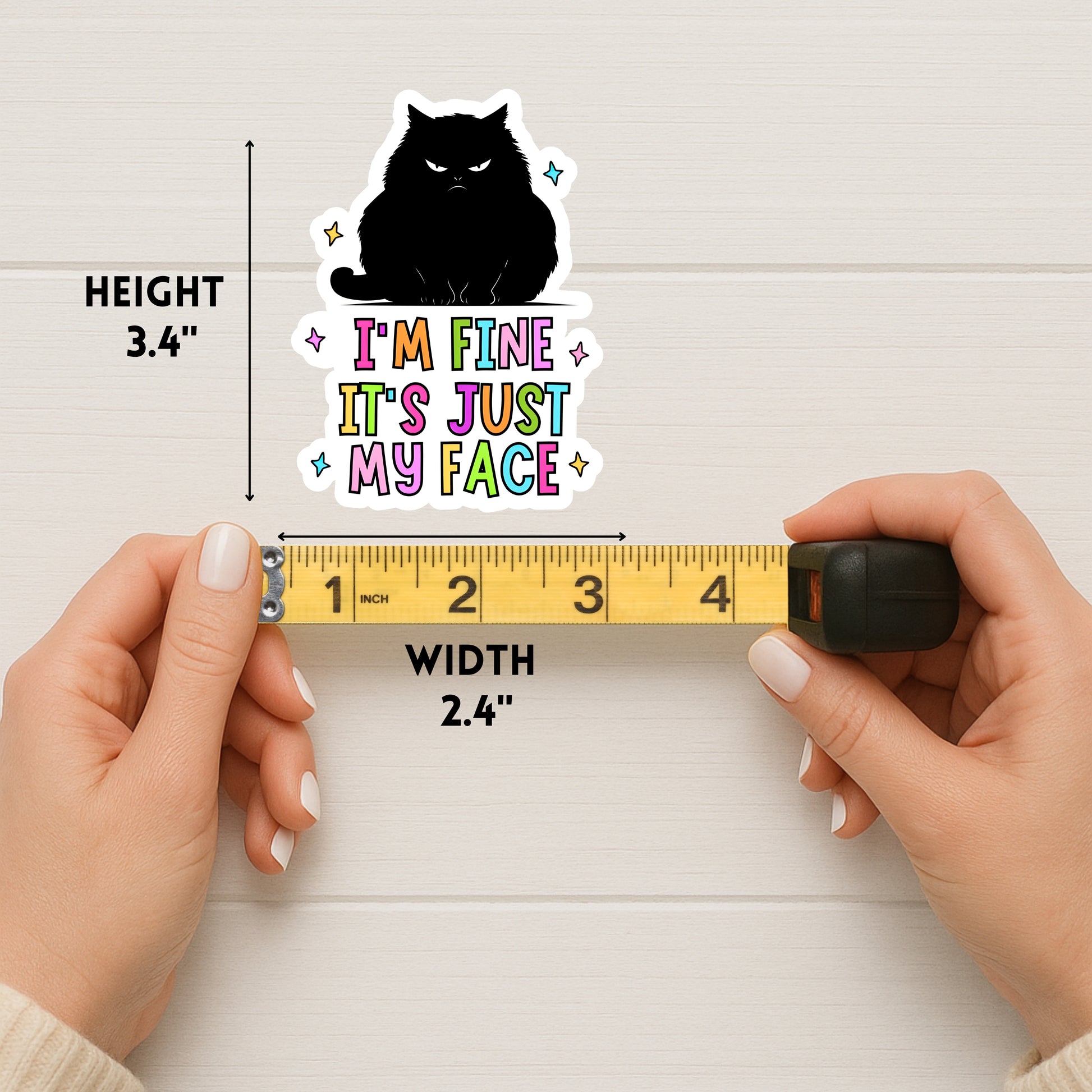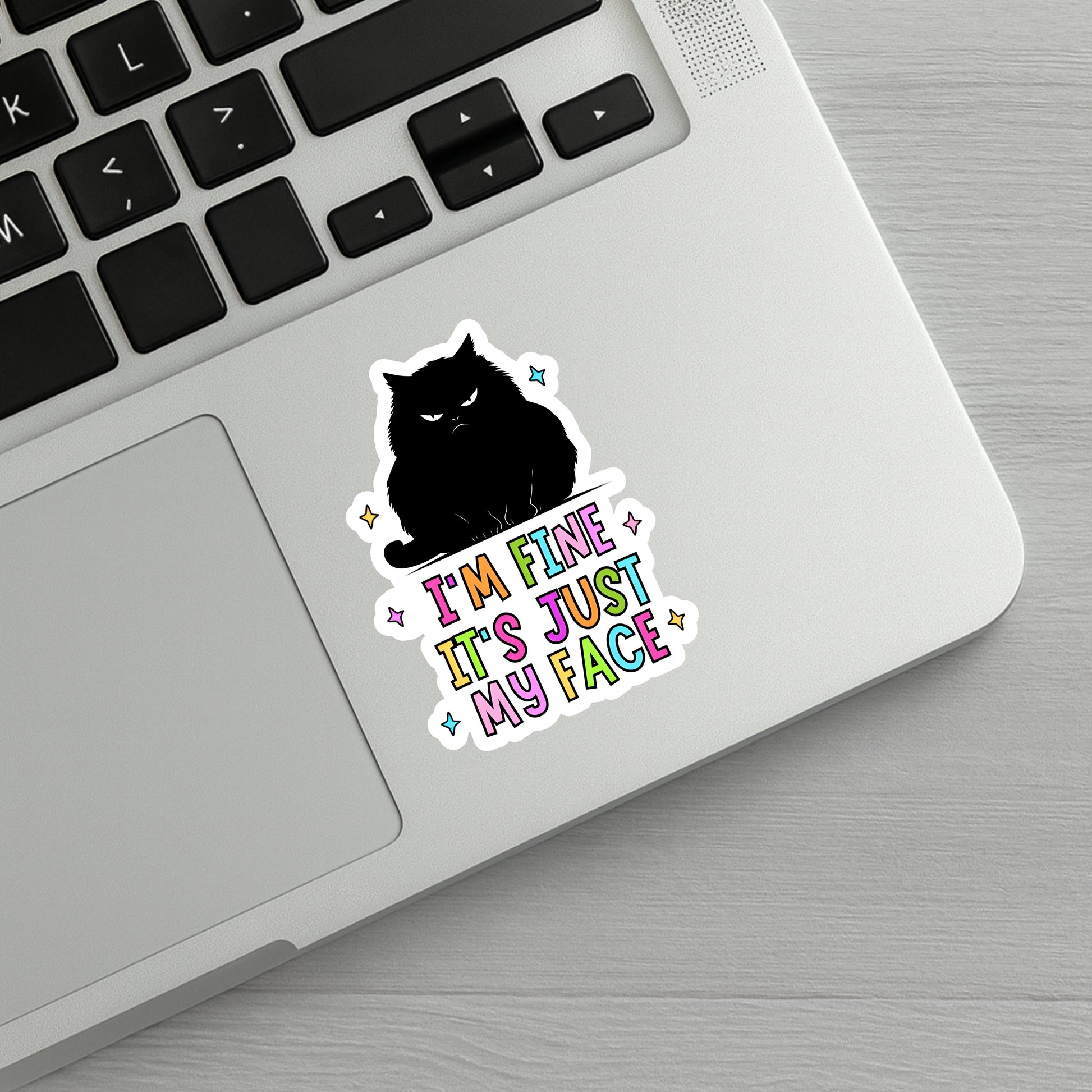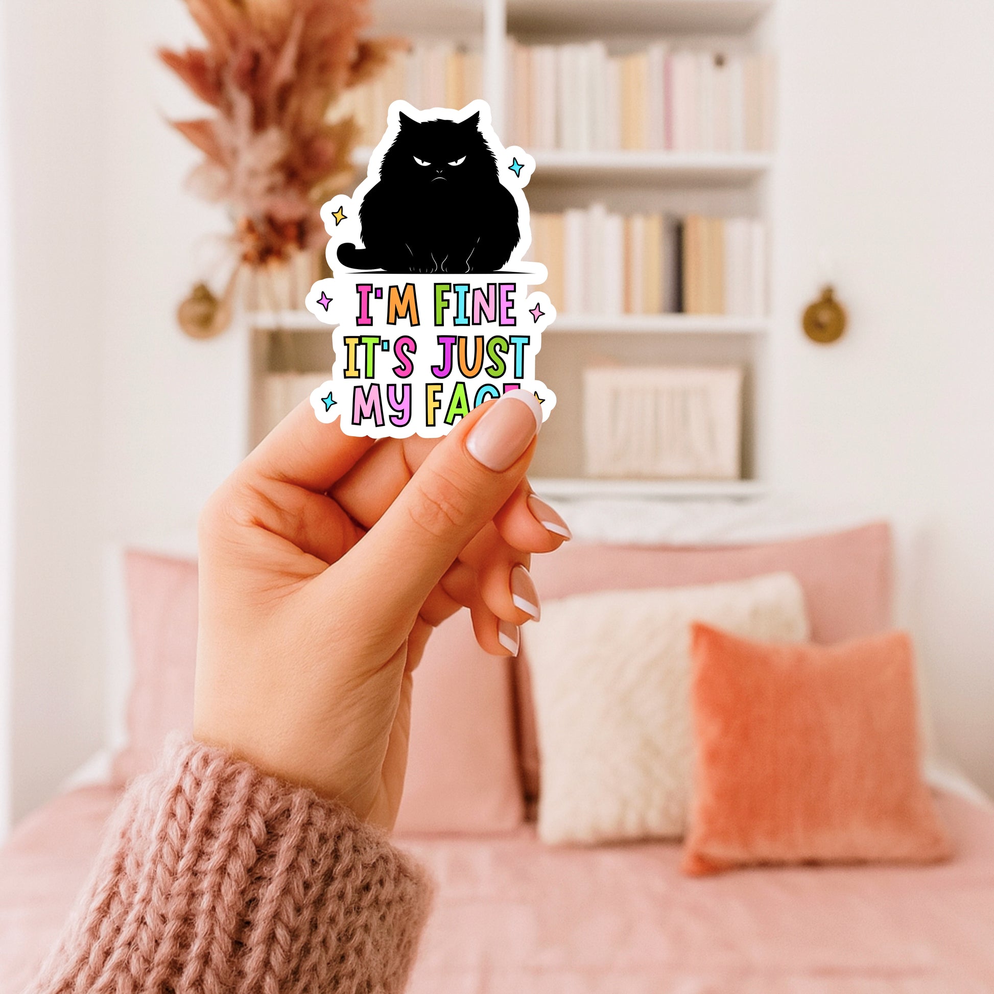 A handmade, hilarious sticker featuring a cat with the ultimate resting bitch face and the phrase, “I’m fine, it’s just my face.” Perfect for anyone with an unbothered vibe or who’s tired of hearing “what’s wrong?” when they’re just existing.
