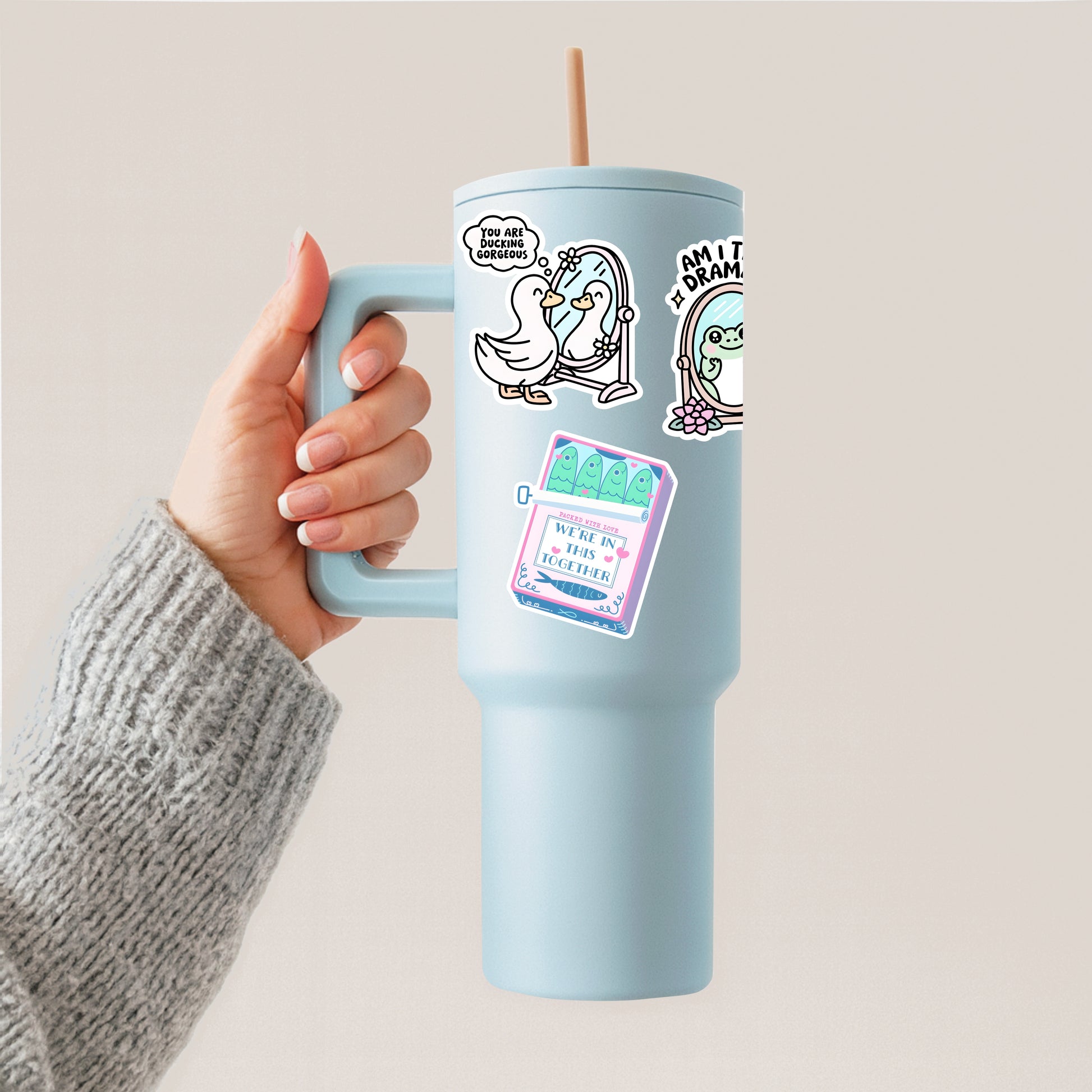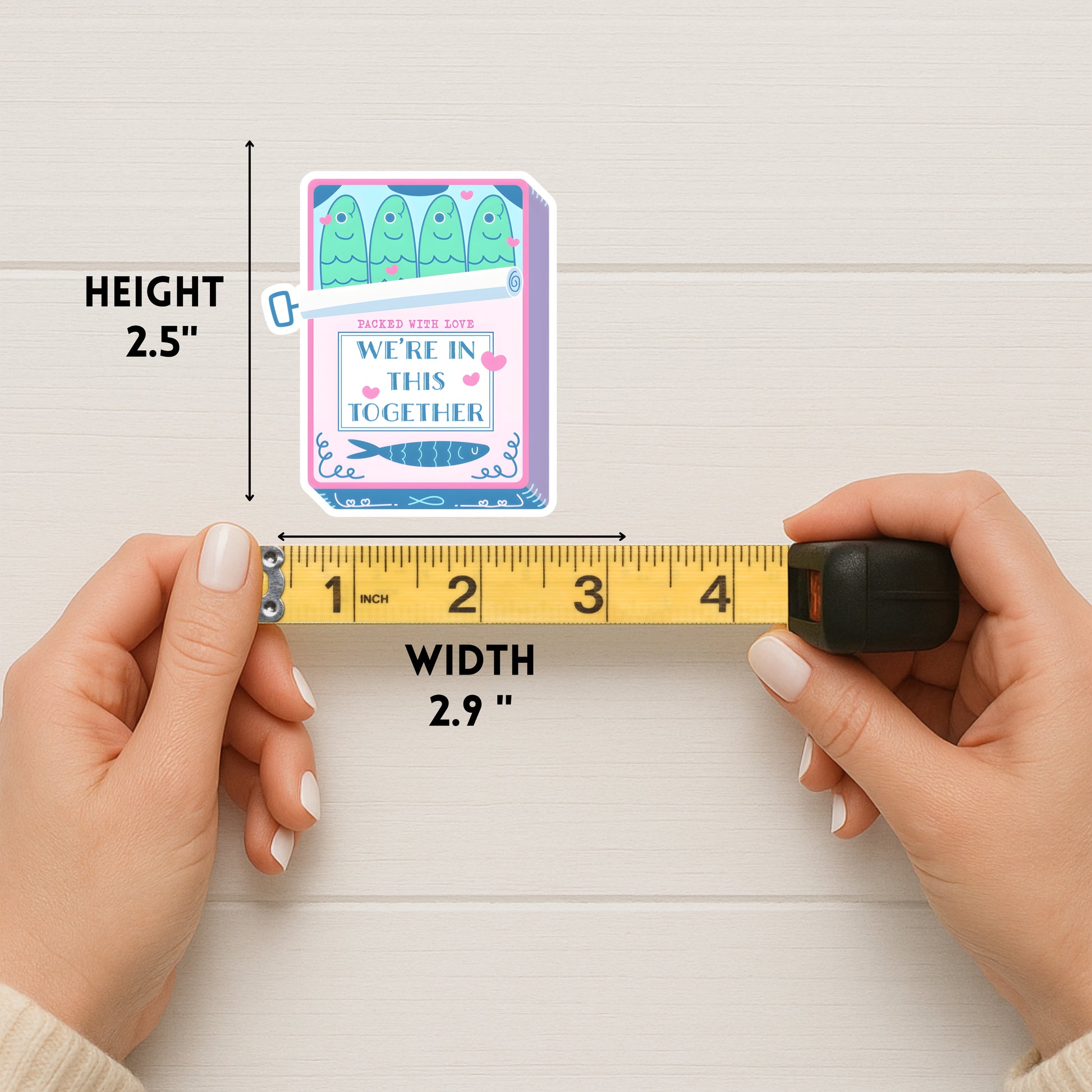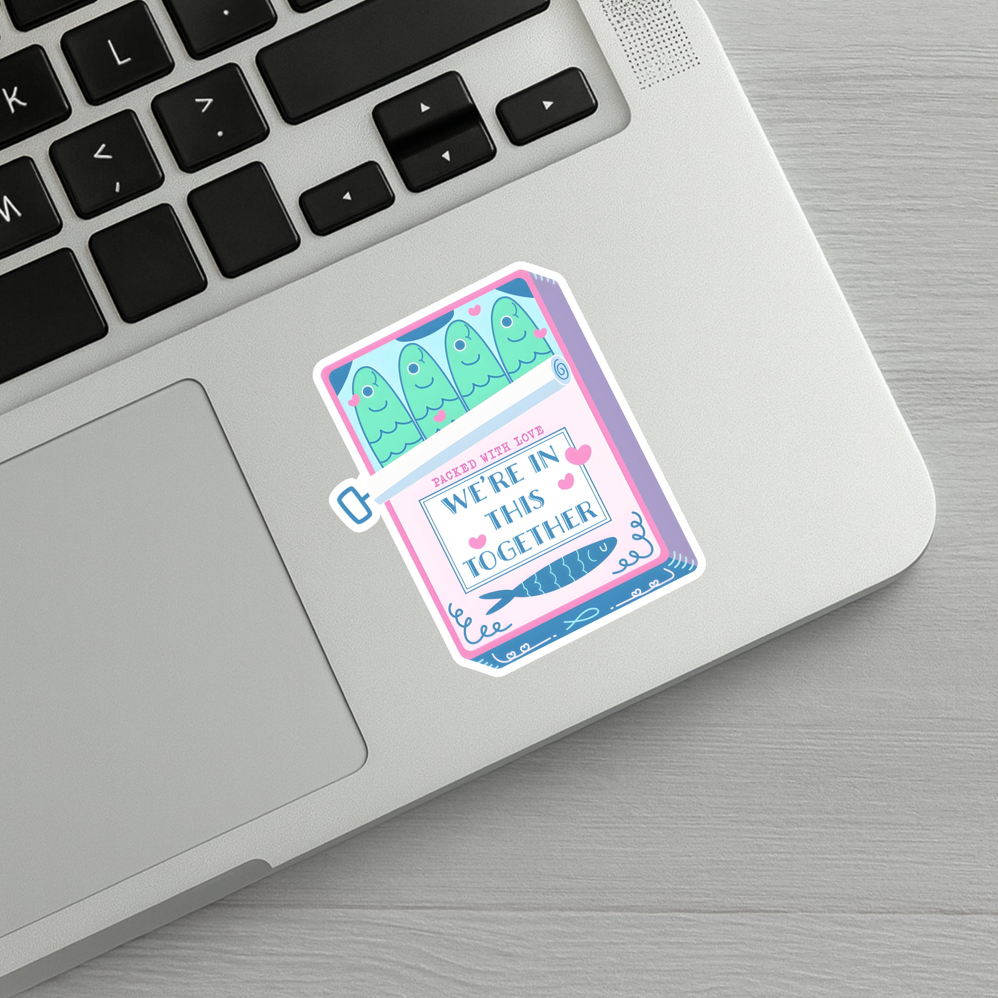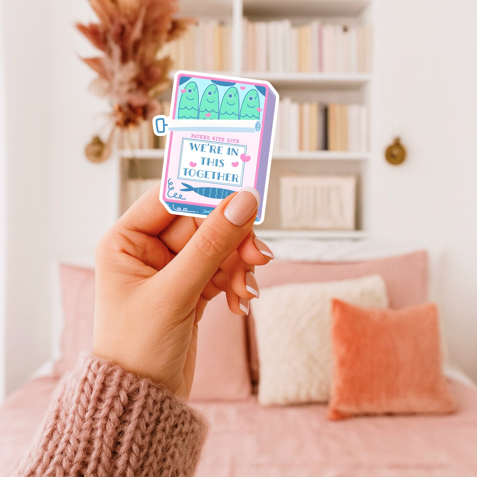 A handmade, heartwarming sticker featuring a pink sardine can with four adorable sardines and the phrase “Packed with Love” above “We’re All in This Together.” A sweet and funny reminder that we’re all swimming through life side by side — perfect for spreading a little love and positivity wherever you stick it.