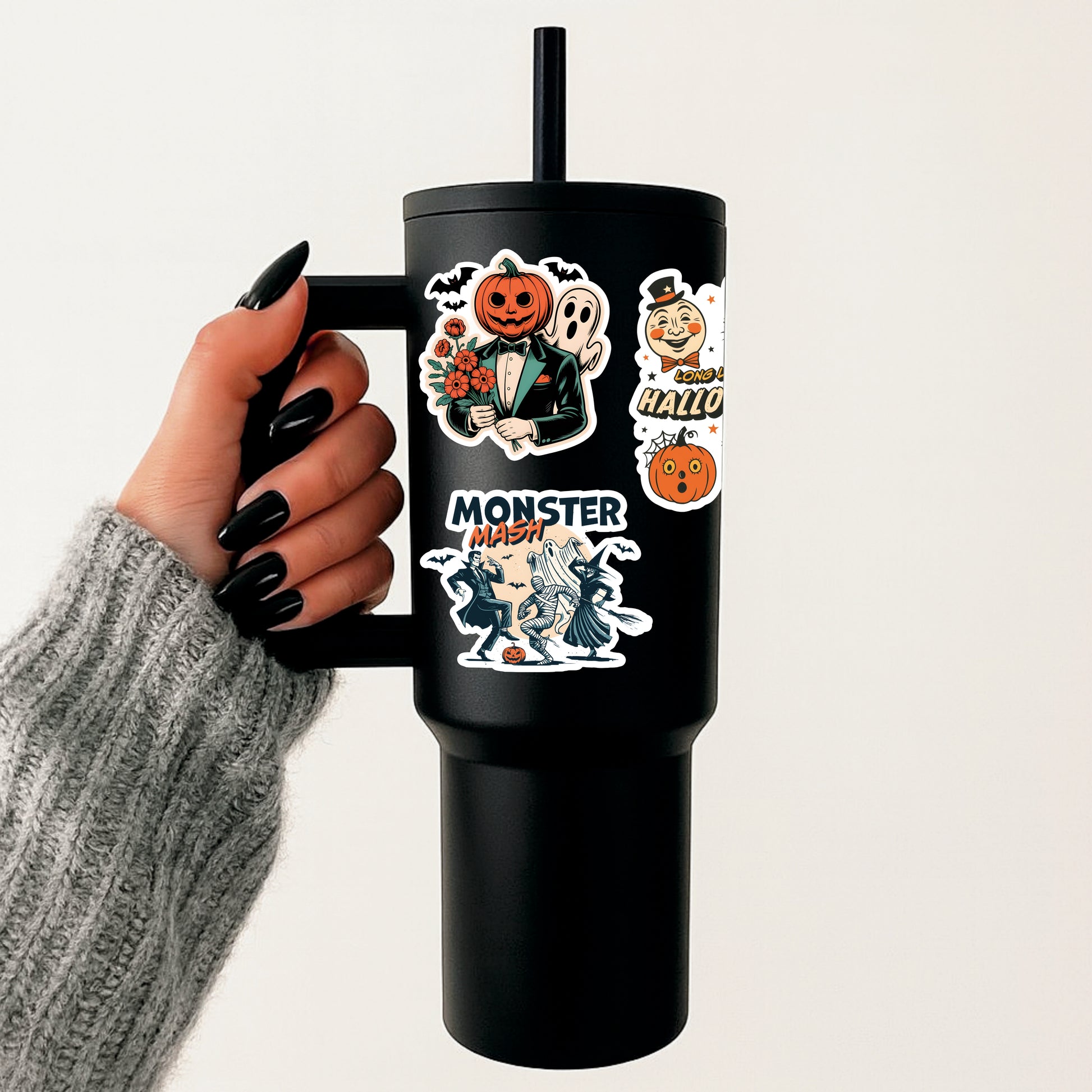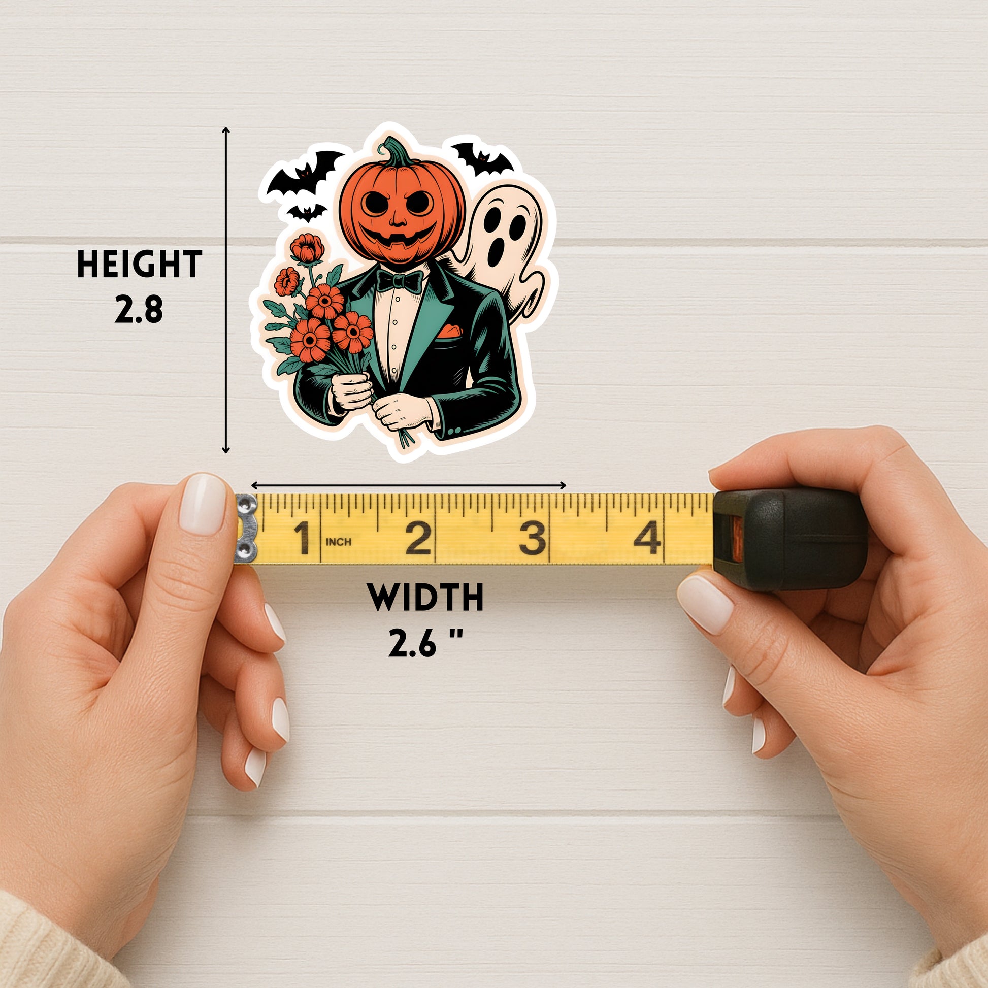 A handmade, spooky sticker perfect for those who love vintage Halloween charm. This design features a pumpkin-headed gentleman in a suit holding a bouquet of flowers — the perfect mix of eerie and elegant. A great addition to any autumn or Halloween collection.