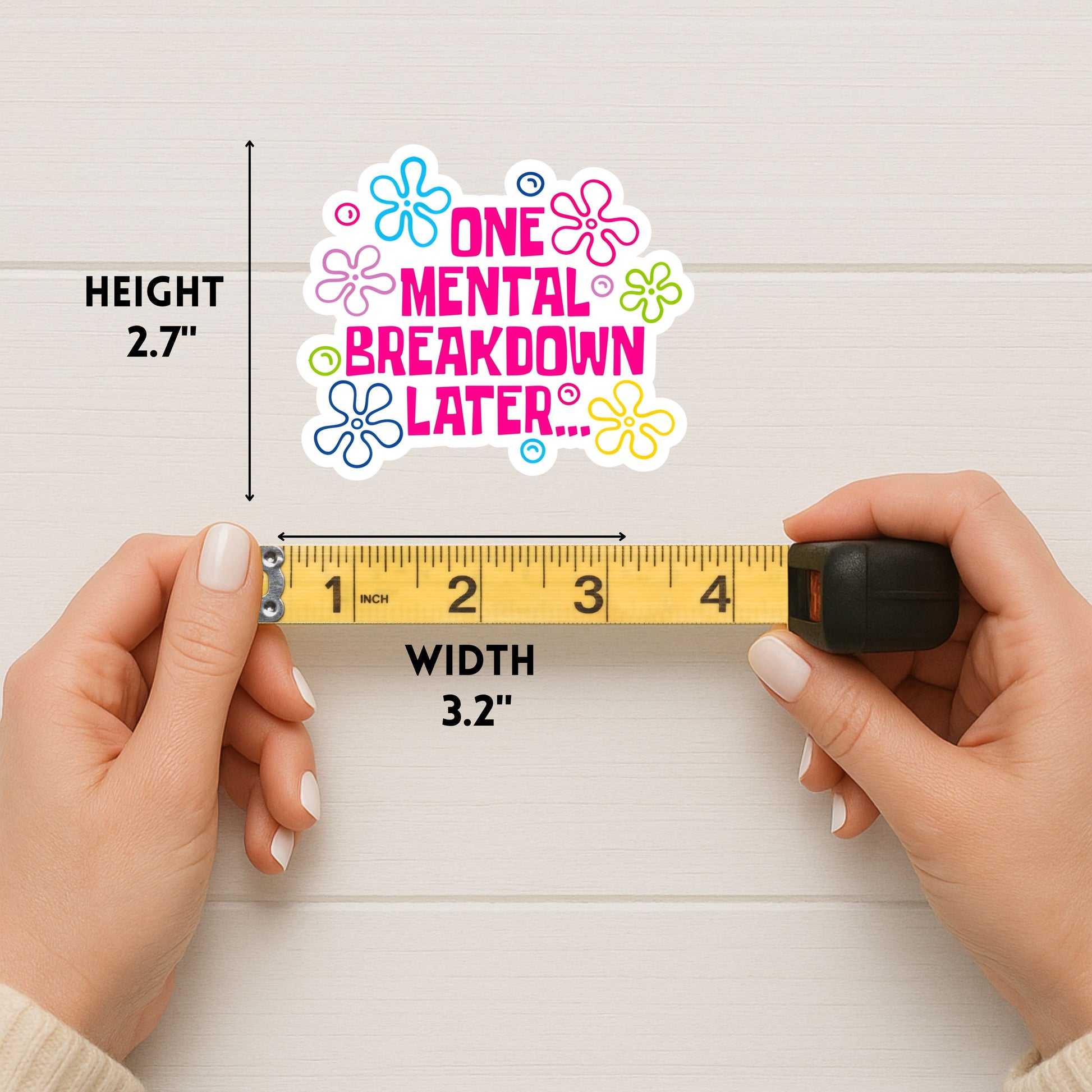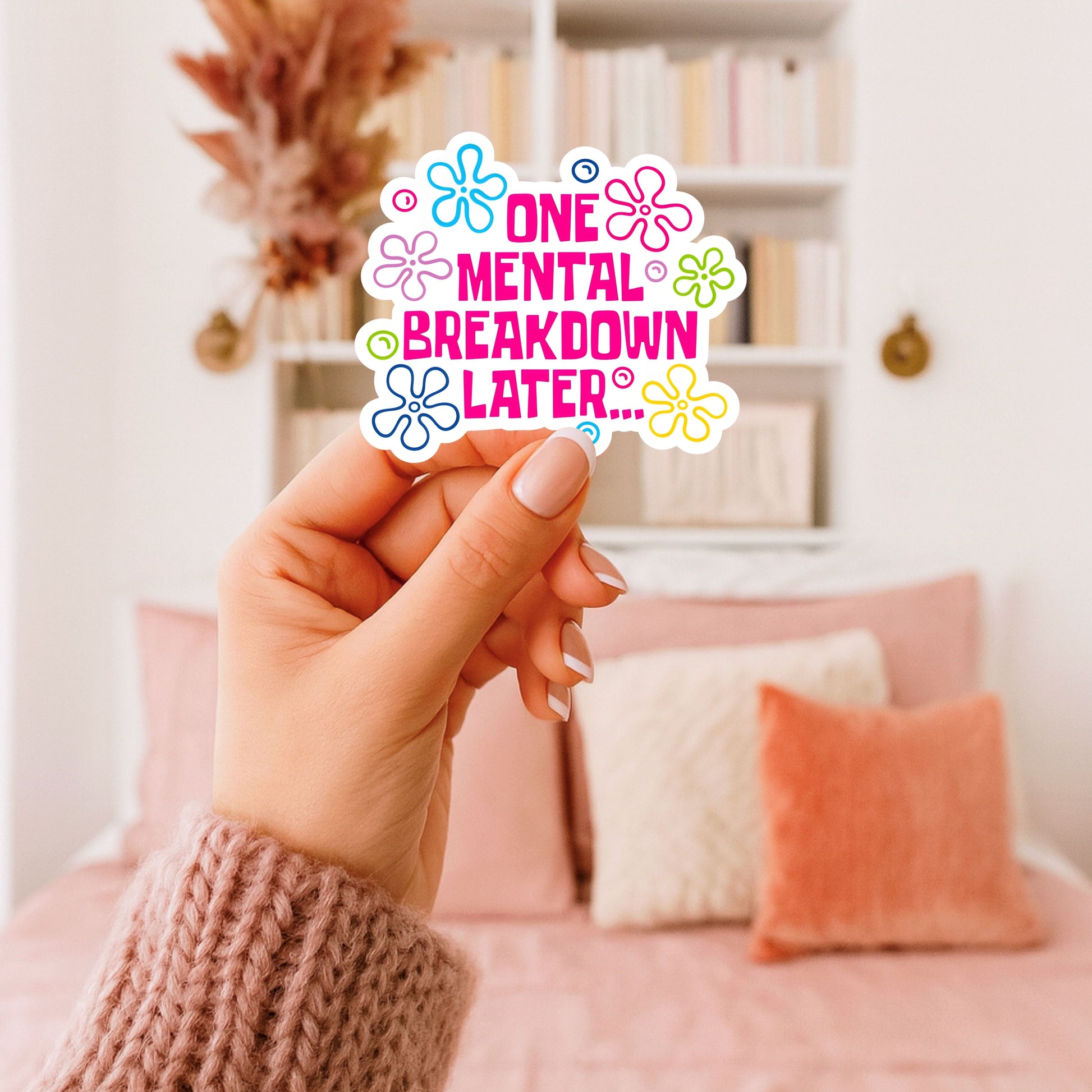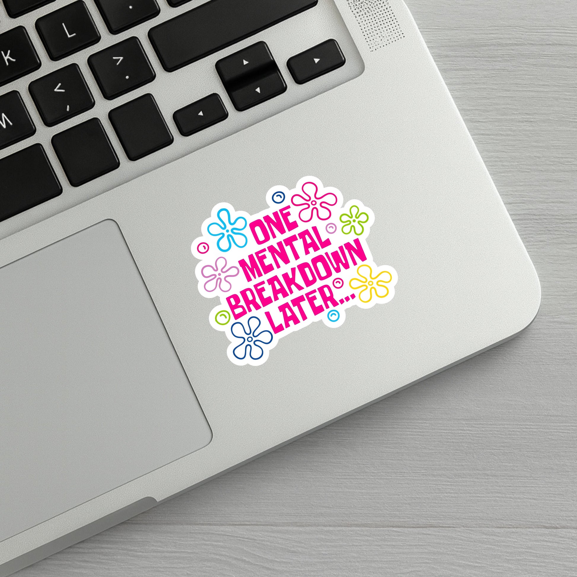 A handmade, funny sticker featuring a colorful text design that reads “One Mental Breakdown Later.” Perfect for anyone who gets through life one meltdown at a time — with humor, of course. Great for laptops, notebooks, water bottles, and more.