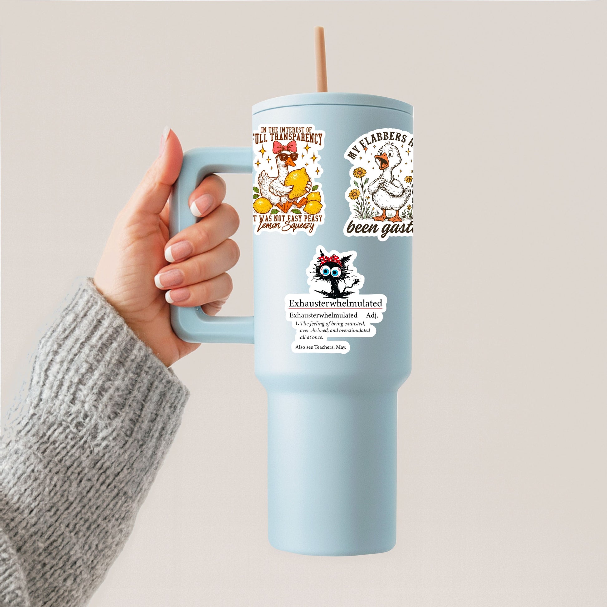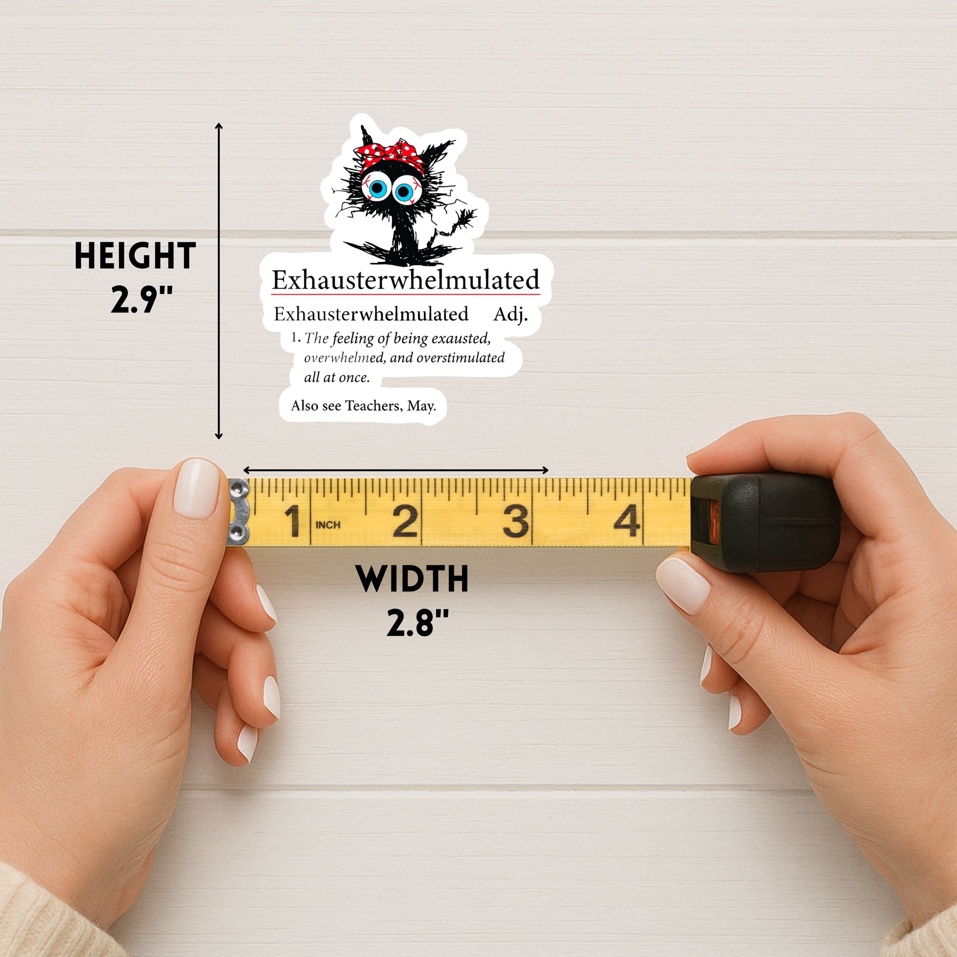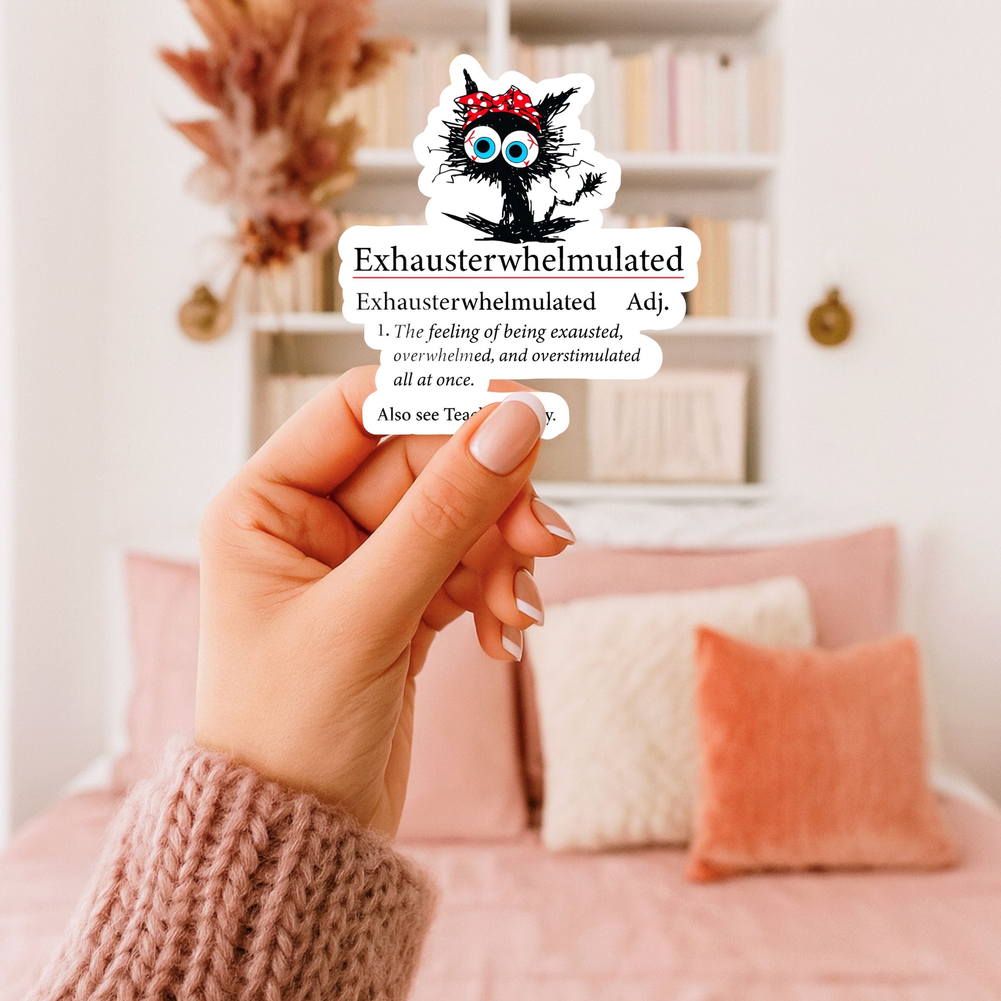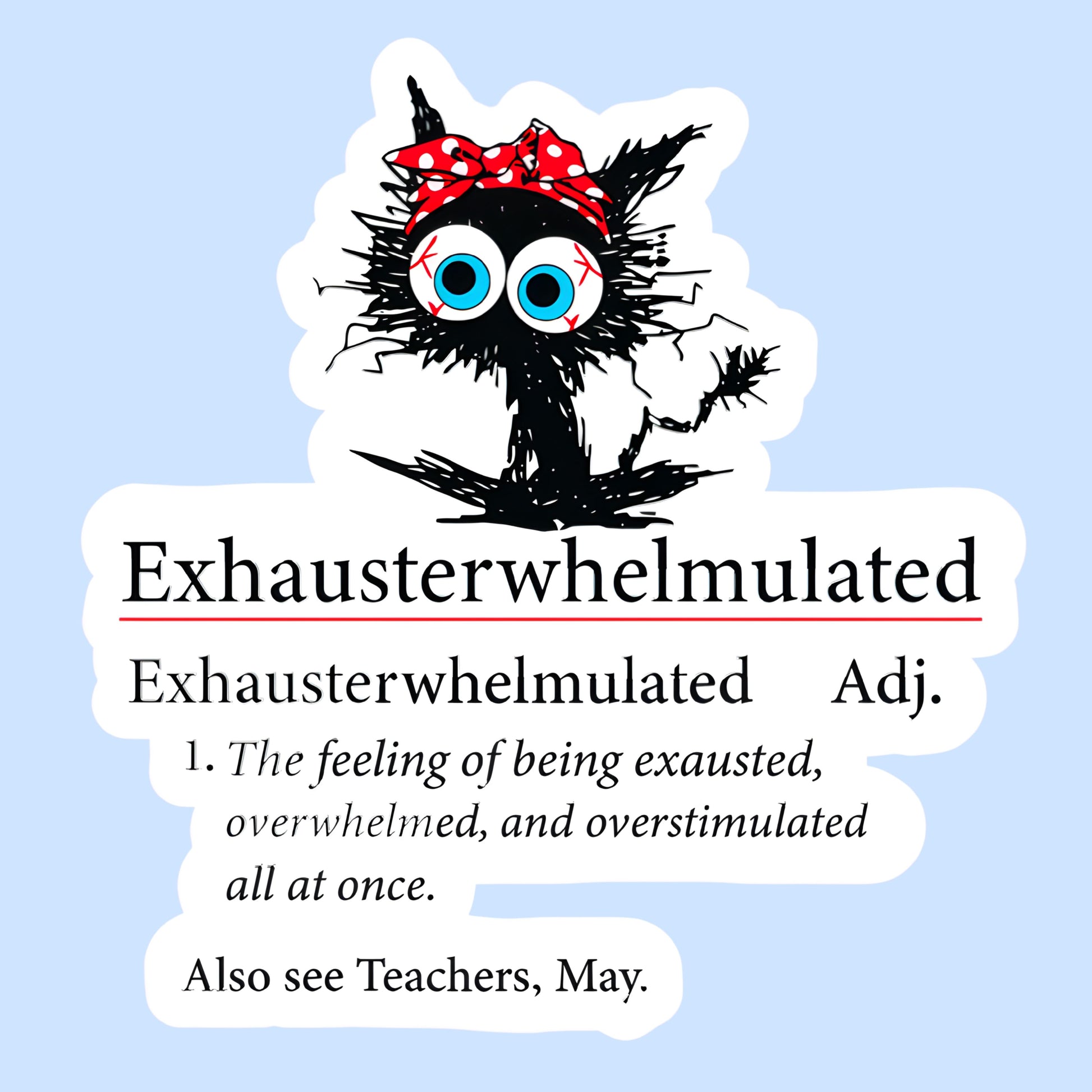 A handmade, relatable sticker featuring the definition of Exhausterwhelmulated — the feeling of being exhausted, overwhelmed, and overstimulated all at once. Perfect for anyone who’s running on fumes but still trying their best.