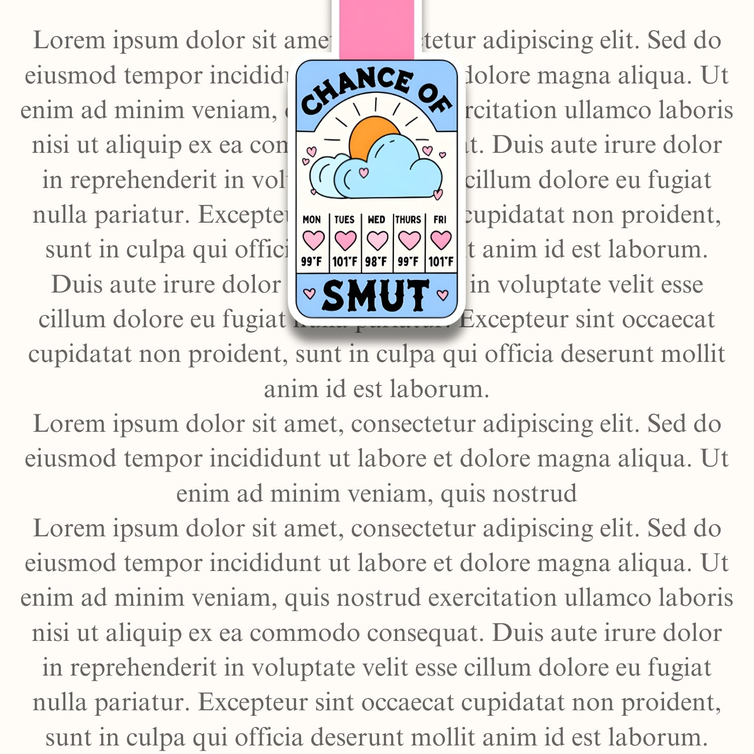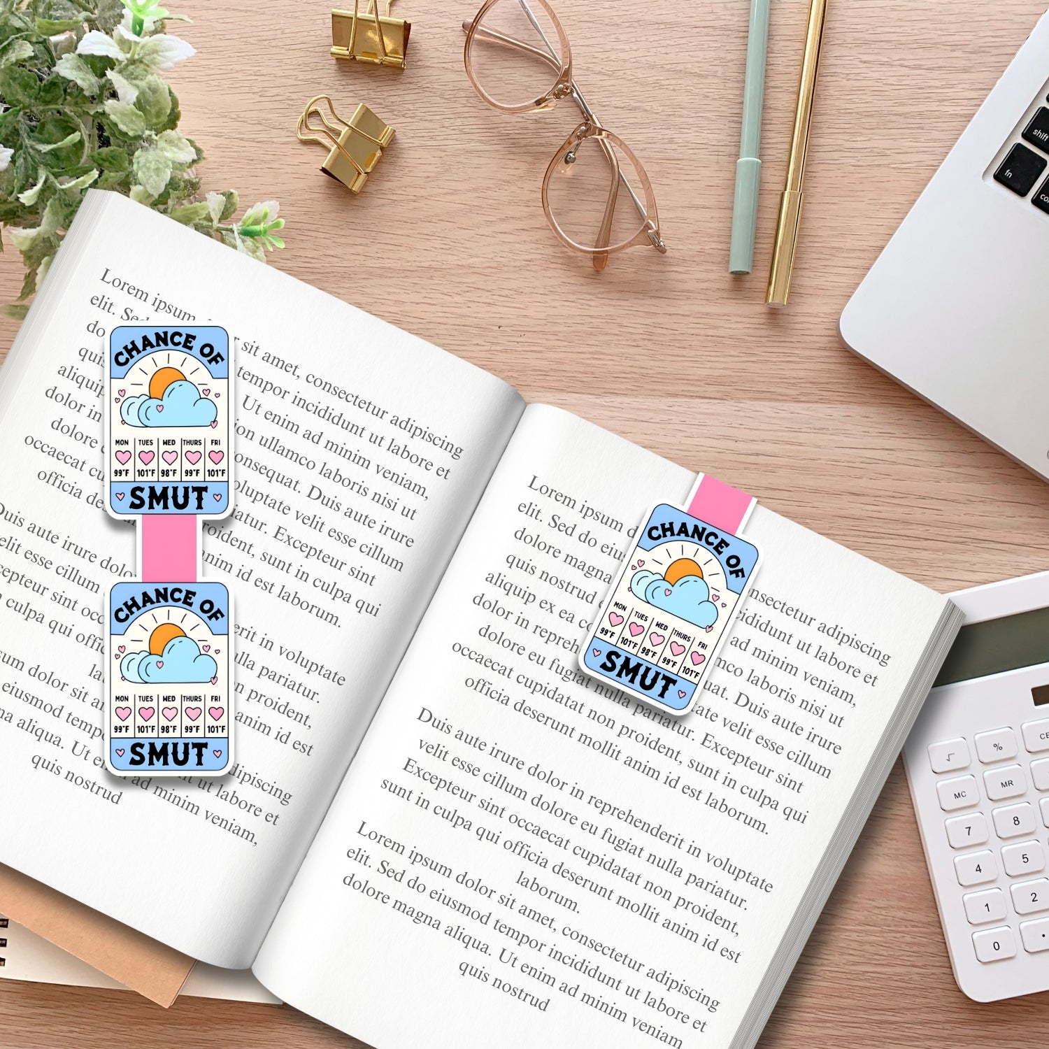 This completely handmade magnetic bookmark features a humorous weekly weather forecast themed around “Chance of Smut,” making it a perfect accessory for romance readers and mood readers alike. Styled like a playful forecast chart, this design adds a fun, cheeky touch to your reading routine without being explicit. Printed on high-quality magnetic paper and sealed with an Avery clear laminating sheet, this bookmark is slim, lightweight, and eye-catching.