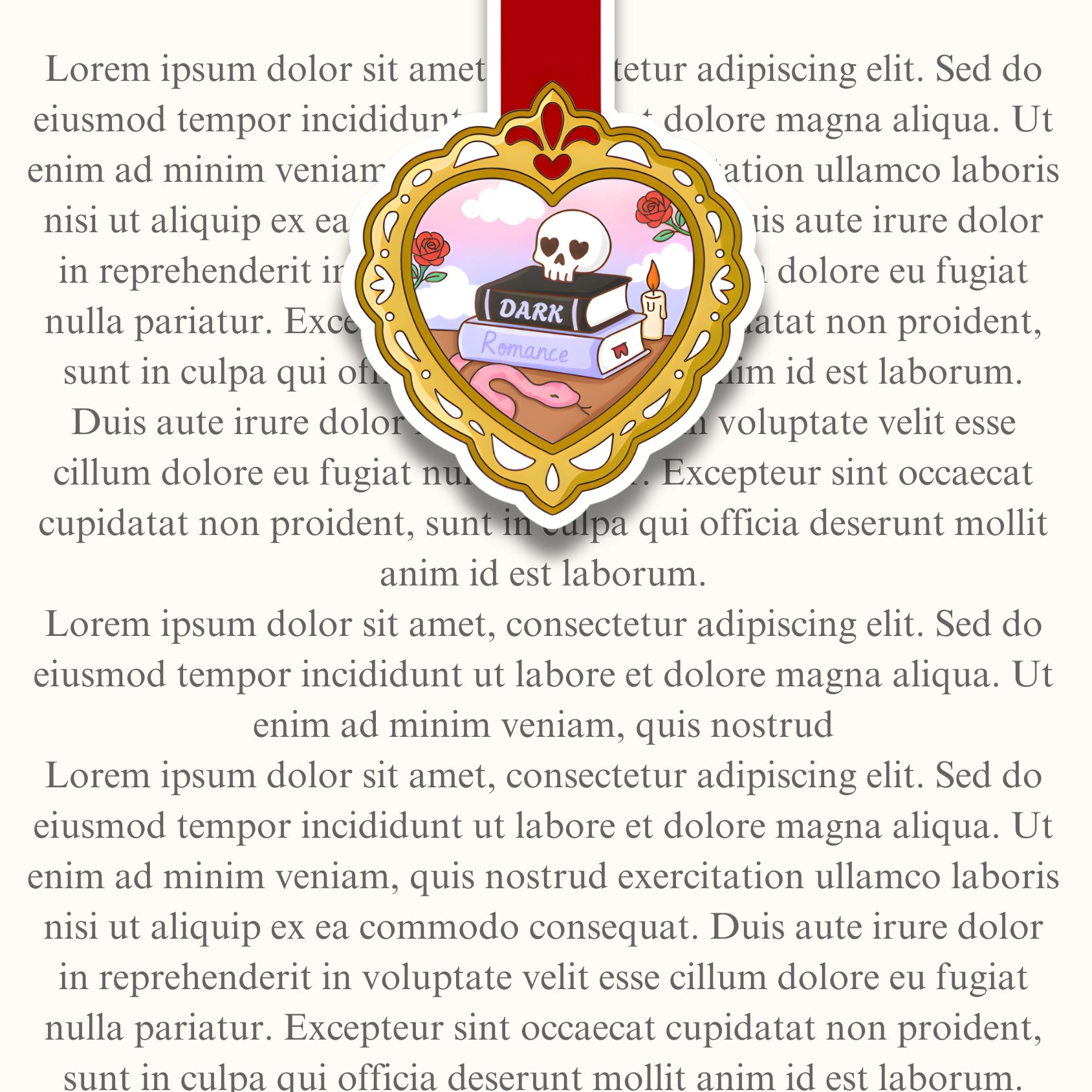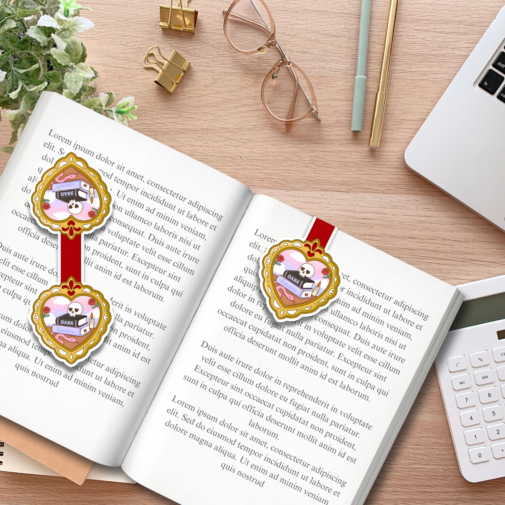 This magnetic bookmark features a gold frame design with a dark romance-themed image inside. Printed on high-quality magnetic paper and topped with an Avery clear laminating sheet, this bookmark is slim, lightweight, and perfect for keeping your place while adding a touch of dramatic flair to your reading experience.
