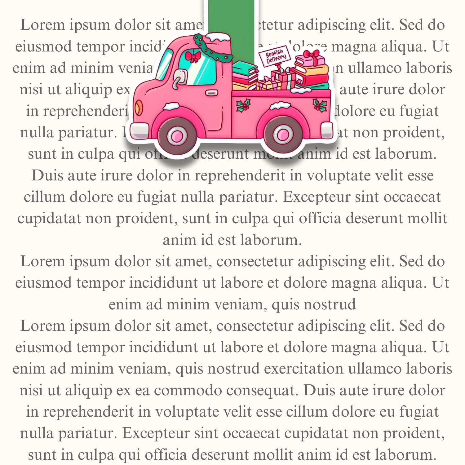 This handmade magnetic bookmark features a festive pink Christmas truck filled with wrapped presents and stacked books in the back, blending holiday cheer with cozy bookish vibes. Printed on high-quality magnetic paper and sealed with an Avery clear laminating sheet, this bookmark is slim, lightweight, and perfect for seasonal reading or gifting.