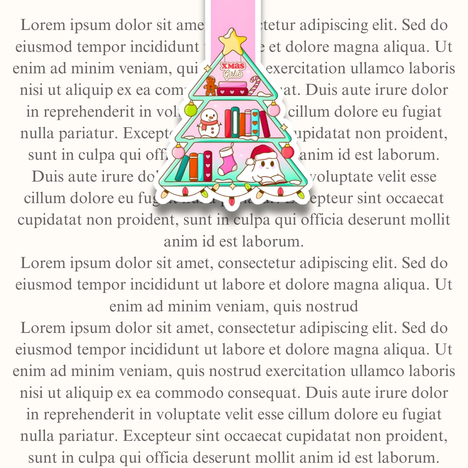 This handmade magnetic bookmark features a Christmas tree outline filled with three shelves containing festive holiday icons in soft pink and blue tones. With a cozy bookish theme and cheerful seasonal details, it’s perfect for winter reading or gifting. Printed on high-quality magnetic paper and sealed with an Avery clear laminating sheet, this bookmark is slim, lightweight, and beautifully festive.